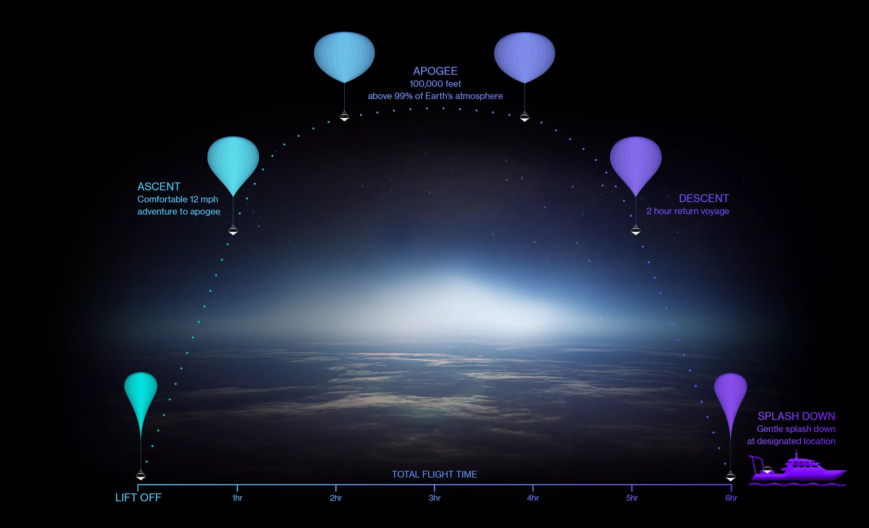 The flight path for the Spaceship Neptune, which will transport eight lucky guests into orbit 100,000 feet above the Earth for a two-hour trip.