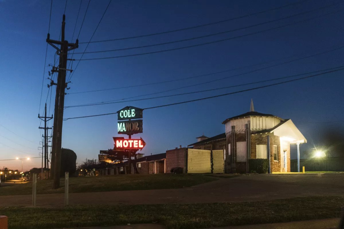 The half-lit sign illuminates the motel, Cole Manor on Harry Hines.