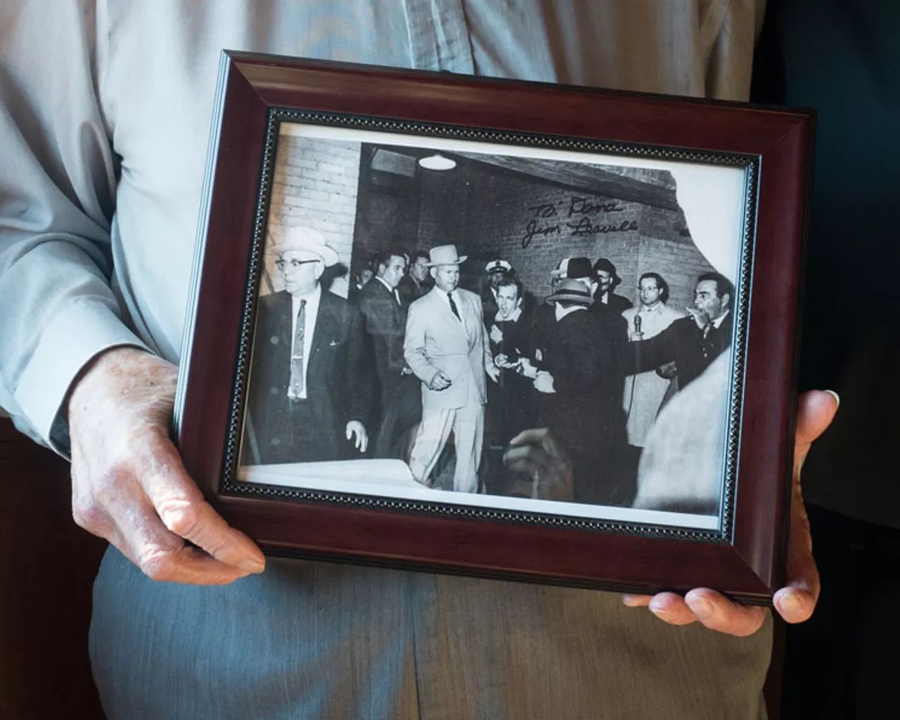 Former homicide detective Jim Leavelle was handcuffed to Lee Harvey Oswald the day Jack Ruby shot Oswald. He’s holding Bob Jackson’s famous photograph immortalizing the moment.