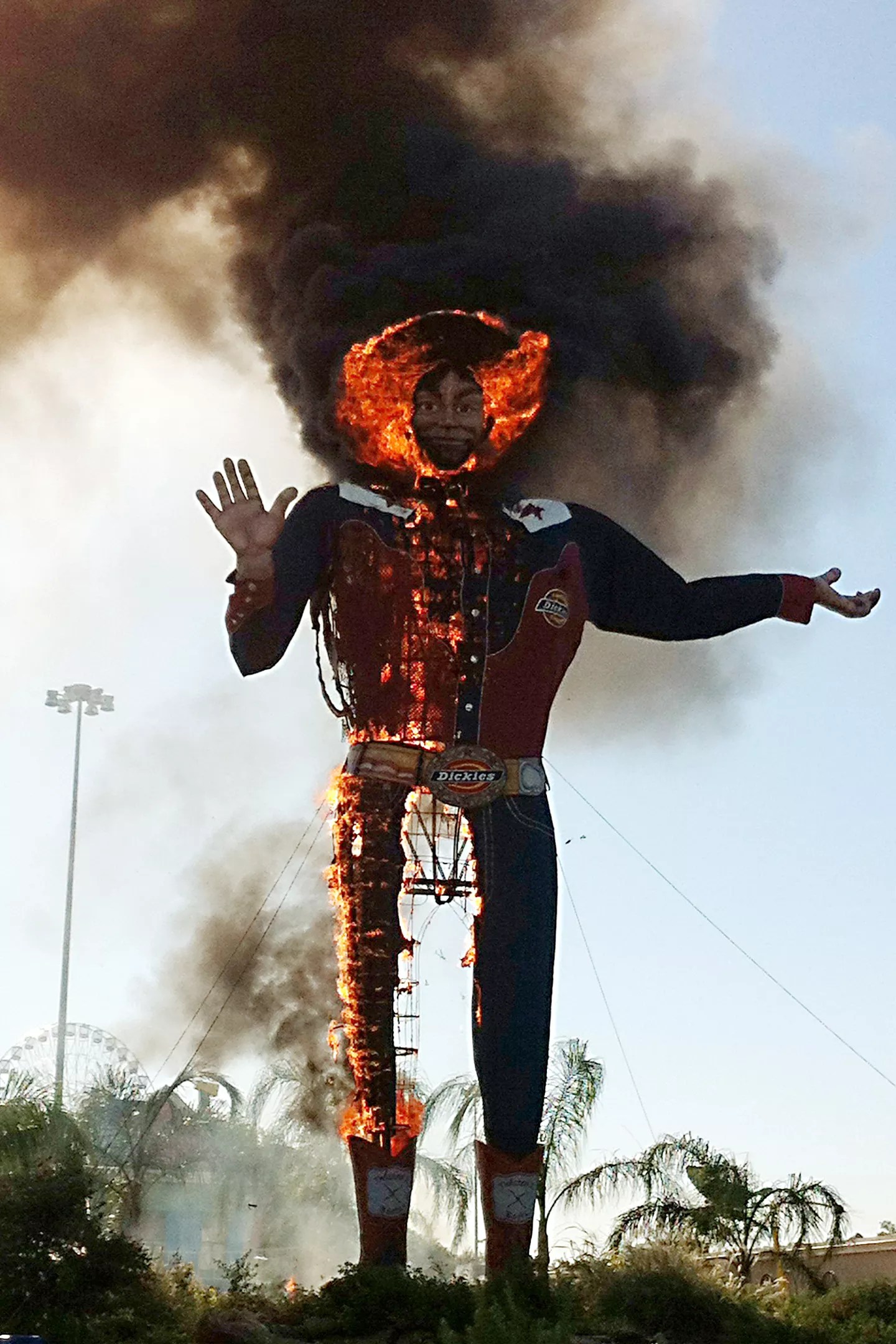Nearly seven years ago, Big Tex, icon of the Texas State Fair, caught fire after 60 years at his post. The mysterious blaze brought the big man low, destroying all but his 50-foot steel frame and the sleeves of his classic Lone Star Wrangler shirt. It was a sad day for Texas, but the Fair must go on, and the construction of a new Big Tex started right away. New Big Tex assumed his rightful place at the center of the fairgrounds in 2013 with a clean white shirt, new boots, and extra 5 feet of height for good measure.