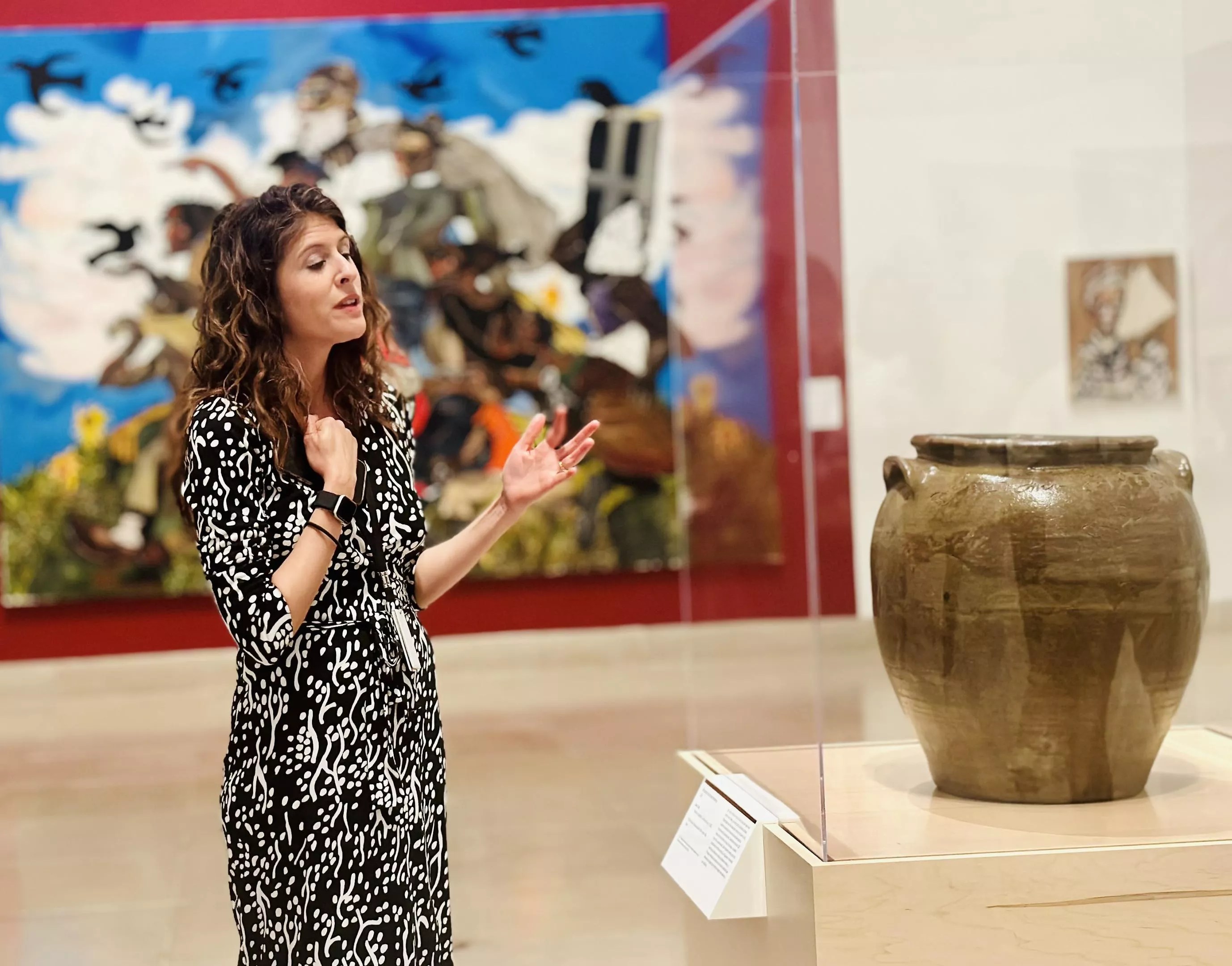 Brodbeck concluded her remarks by showing us a large ceramic vase created by David Drake, an enslaved potter who was active during the antebellum era, The vase is notable for being a signed piece from a time when enslaved people had no ownership of their work.