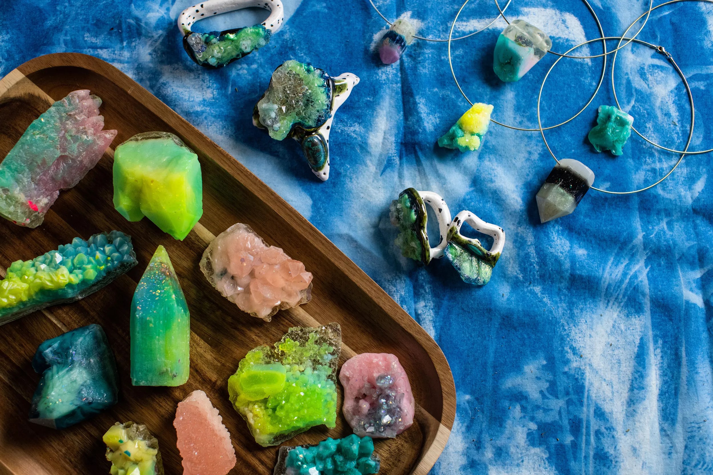 She moved from prints to her first specialty, cyanotypes, an analog form of photography in which one can “print” flowers and plants directly to paper. Later, she created what she calls “Shamstones,” often glow-in-the-dark, neon-colored crystals that she incorporates into jewelry, chandeliers and other works. She also makes smudge sticks -bundles such as sage with purported cleansing properties – and patrons now are burning them faster than she can make them.