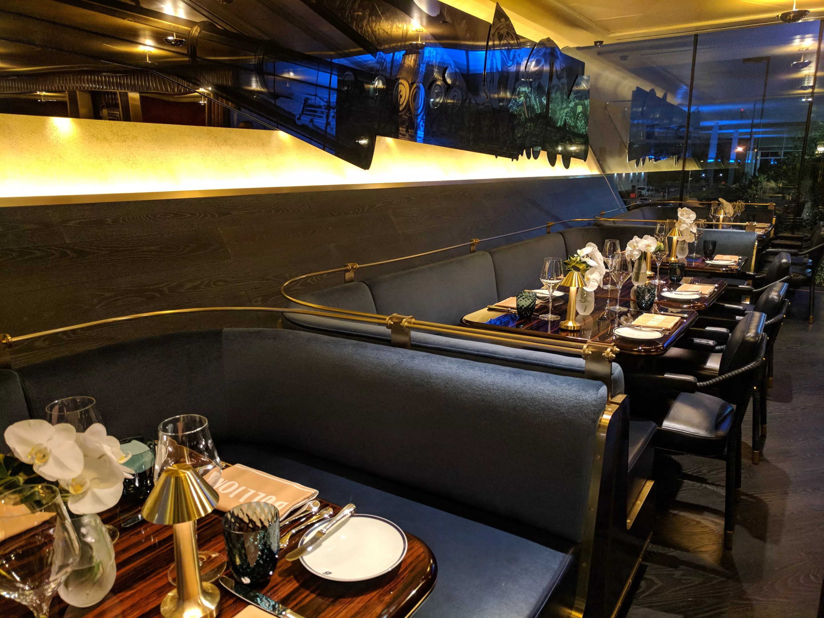 An aluminum and steel artwork by Kathryn Andrews is displayed above booths in Bullion.