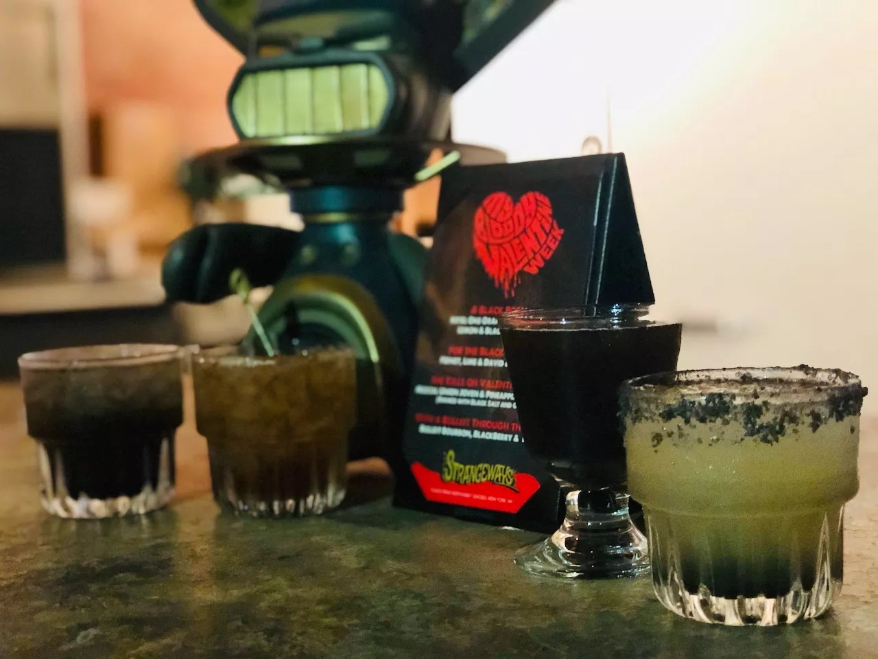 Strangeways has a special drink menu called My Bloody Valentine Week, with drinks such as A Black Rose, For the Black Widow, She Kills on Valentine’s Day, With a Bullleit Through the Heart. Did you get that story line there? If you did, you’re savvy enough to imbibe. If not, stay home.