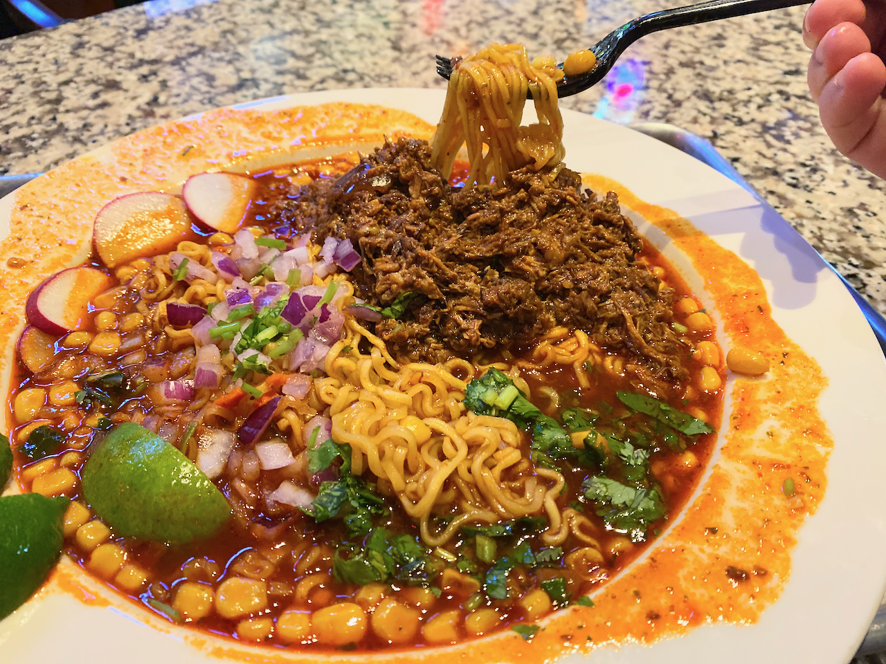 We started with the brisket ramen, a kaleidoscope of cultures in a bowl. The old plastic containers have been replaced with large ceramic bowls, which makes for a great presentation of the dish. Ramirez uses Tapatío instant ramen but makes the consomme from scratch every morning, which serves as the base here. He says he throws in the Tapatio spice packet that comes with it for a pop of flavor. All of this is served with a big scoop of finely minced chopped brisket, cilantro, onions, limes and a few slices of radish.