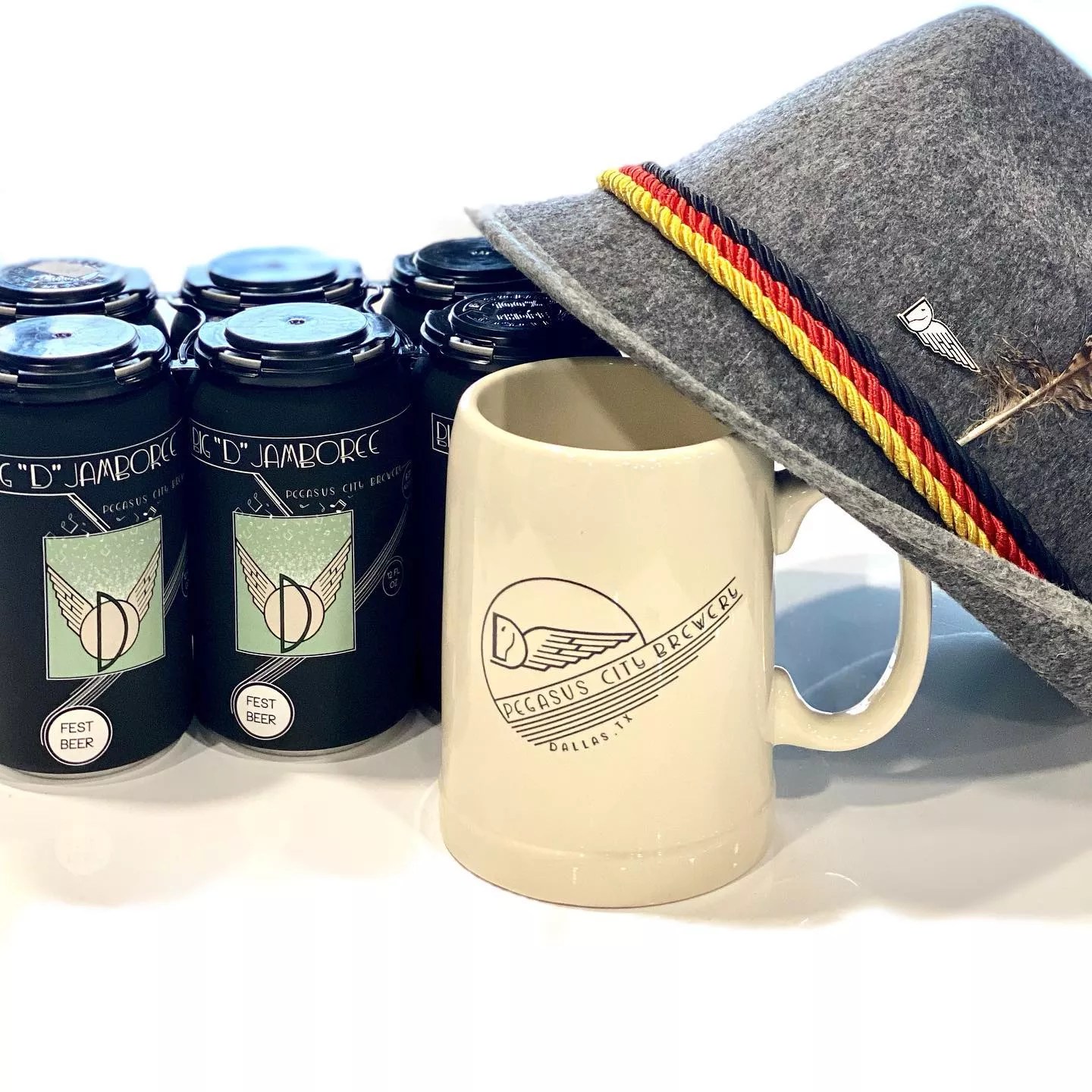 They have a $45 party pack that includes a felt alpine hat and a limited edition Pegasus City ceramic stein to go along with a six-pack of Big “D” Jamboree, which is named after a local 1950s radio program.