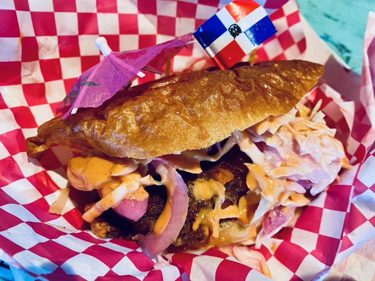 The bread, which is pushed within an inch of its life to hold the sandwich together, is a Mexican bolillo bread. Tavarez says is it’s the closest thing to the bread that is traditionally used. The finished product is lovingly stabbed through with a Dominican flag toothpick.