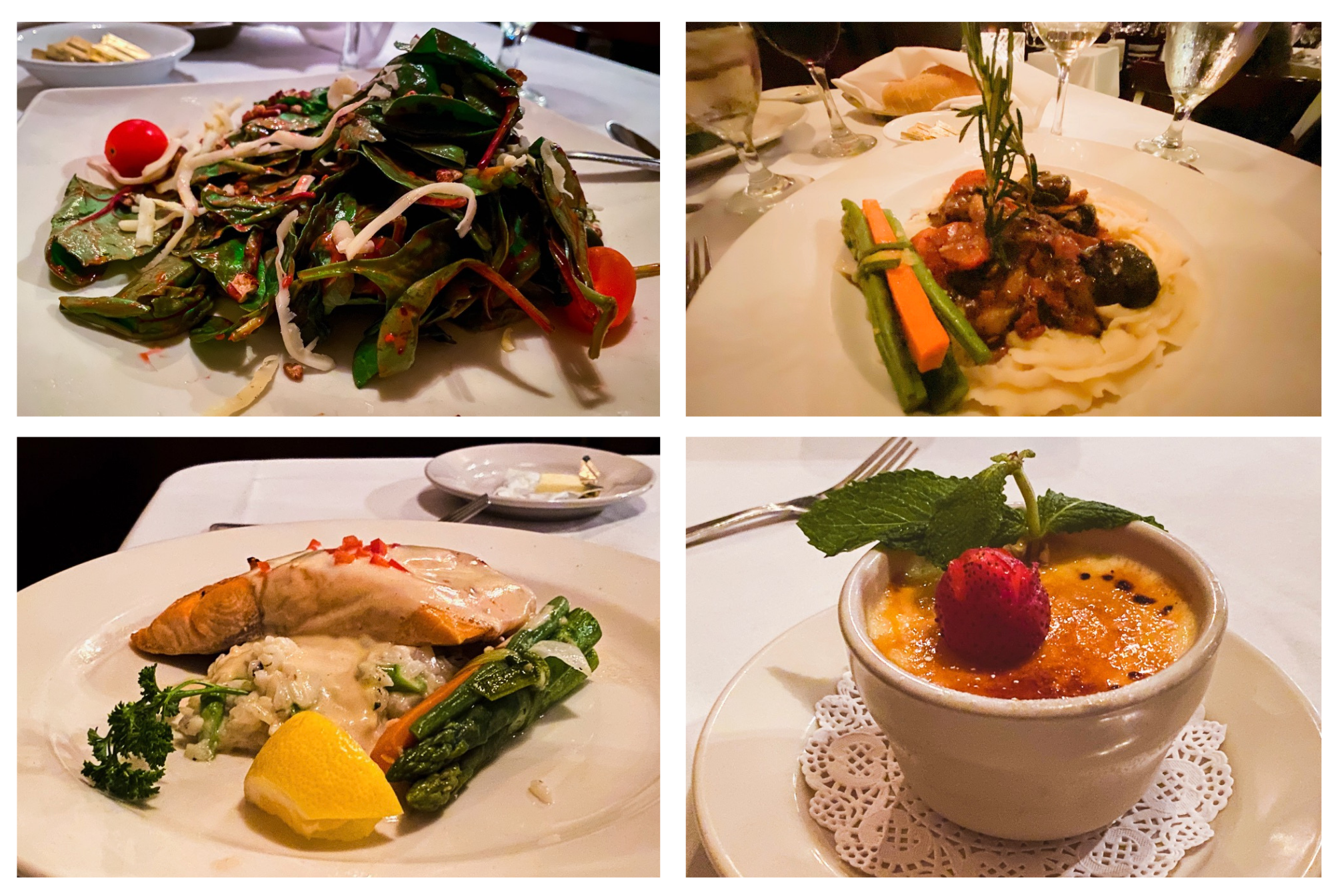 The salmon fillet topped with a Champagne dijonnaise sauce was well executed and the beef tenderloin tips in a Burgundy wine reduction on a bed of elegantly piped whipped potatoes are a classic choice. Traditional crème brûlée with a hint of citrus and a light but flavorful chocolate mousse wrapped our meal.