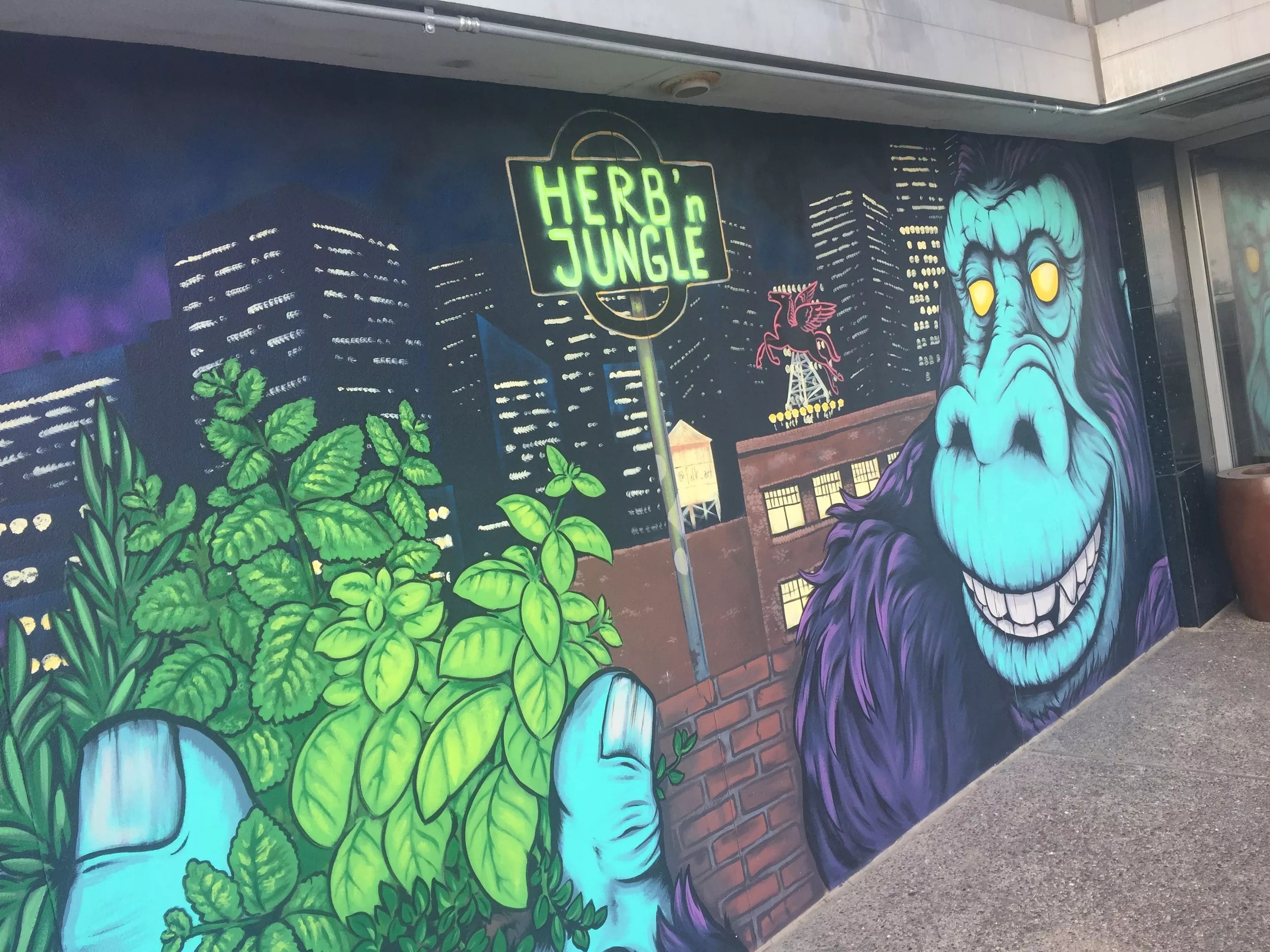 All that’s growing here is surrounded by murals painted by Dallas-based artist Falk Houben, known for work in Deep Ellum. The artwork exemplifies the idea behind the Herb’n Jungle, with a tattooed tiger, a gorilla with a handful of herbs and even a poor, dead pigeon backed by the Dallas skyline. A mighty phoenix is soaring above the Sheraton’s silhouette.