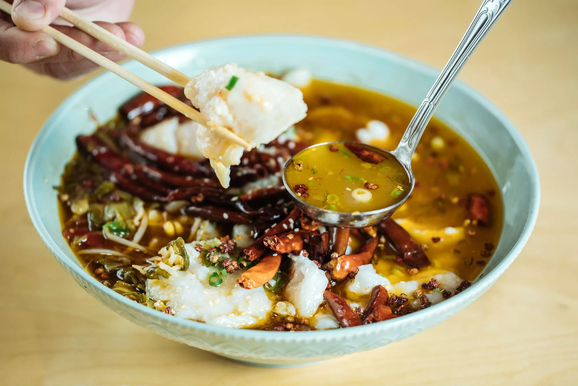 A trip to a Sichuanese restaurant isn’t complete without ordering a bowl of spicy boiled fish. It looks intimidating. Chunks of white fish fillets are submerged in a fiery red broth and covered with a handful of dried red chili peppers and peppercorns. But it’s more flavor than fire, I promise. And if the spice does, in fact, hit you where it hurts, there’s always the white rice to temper the heat.