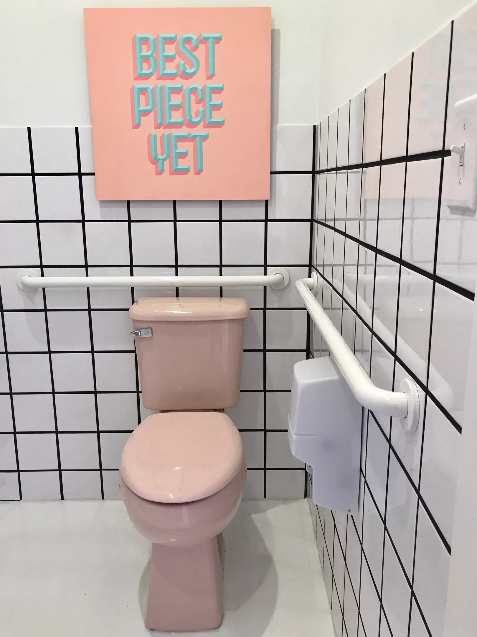 Floppy disks, millennial-pink furniture and tongue-in-cheek artwork from Dallas artist Brennen Bechtol accent the fun, modern space. In the bathroom, you’ll find a working pink telephone. “When you call your friend from the Internet Cafe bathroom, the caller ID comes up Internet Cafe bathroom,” Megan says. The phone pokes fun of people’s tendency to check email and social media on their phones while in the bathroom. The bathroom at Internet Cafe 2. Beth Rankin