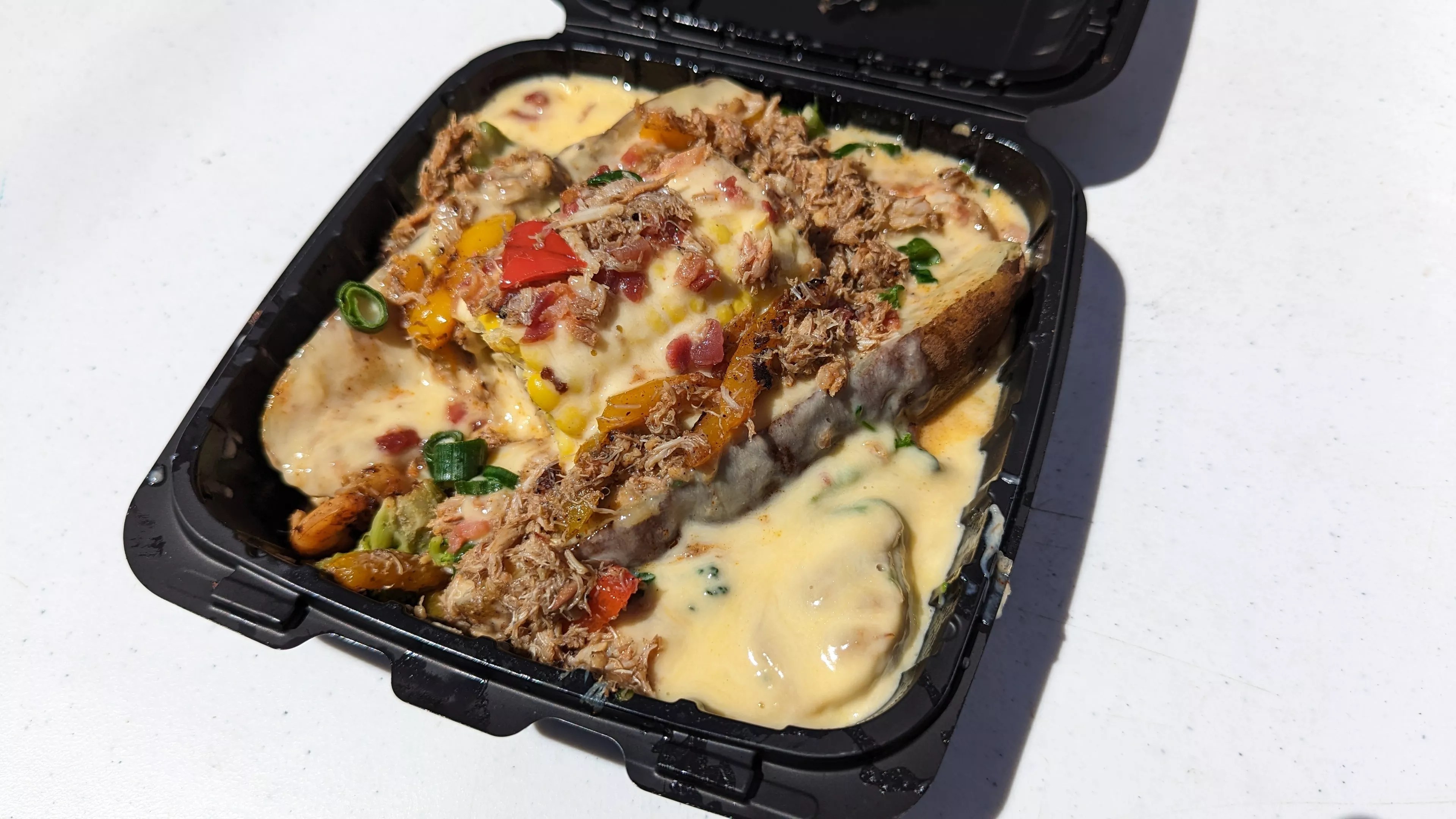 Mac and cheese topped with Buffalo chicken from Mac and Fromage.