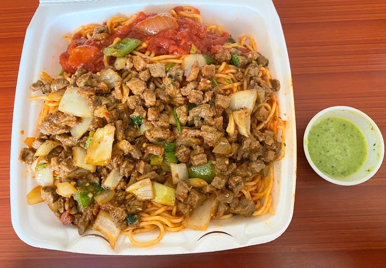 My meal was ready in about 15 minutes and was served in a plastic foam box, heavy and filled with noodles, meat and vegetables. The top layer was the beef suqaar, a freshly made combination of chopped beef sautéed with onions, bell peppers and cilantro. Below the suqaar is a thin spaghetti mixed with a chunky red sauce, with extra sauce on the side.