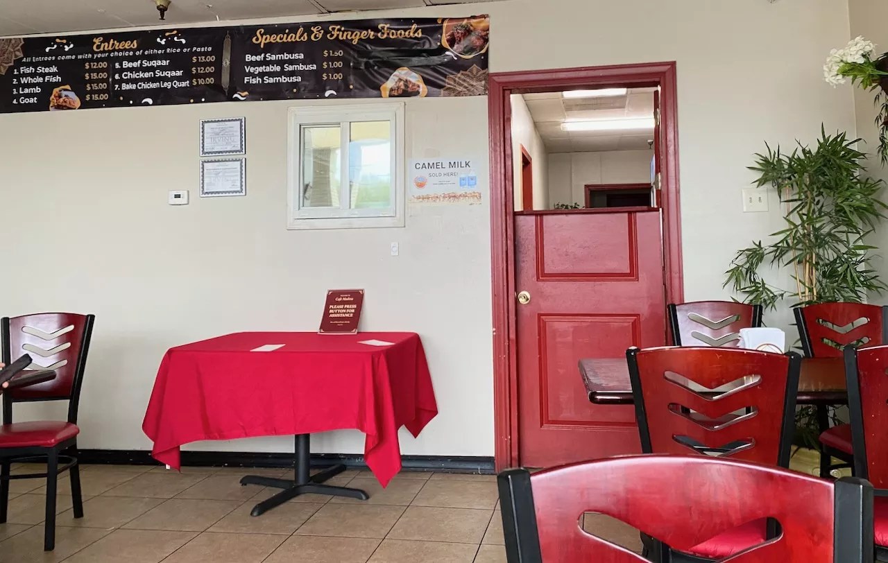 A simple menu hangs high on the wall and lists only 10 items. A smaller sign taped to the wall advertises camel milk. Entrées include fish steak, whole fish, lamb, goat, beef suqaar, chicken suqaar and baked chicken leg quarter, served with your choice of rice or pasta and priced between $10 and $15. Sambusa, a fried savory pastry, is served with either beef, vegetable or fish and are priced between $1 to $1.50. A single paper menu pamphlet at the ordering table includes additional items like mandazi (fried doughnut), a popular item in the mornings that regularly sells out.