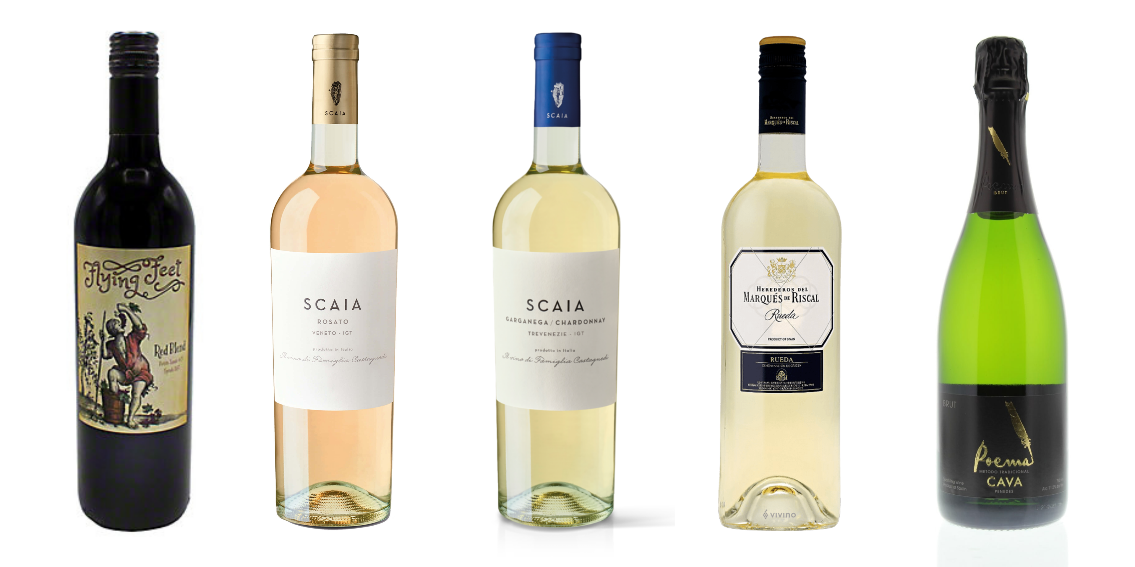 From the left: Flying Feet Red Blend, Scaia Rosé, Scaia White Blend, Marqués de Riscal Verdejo and Poema Brut Cava