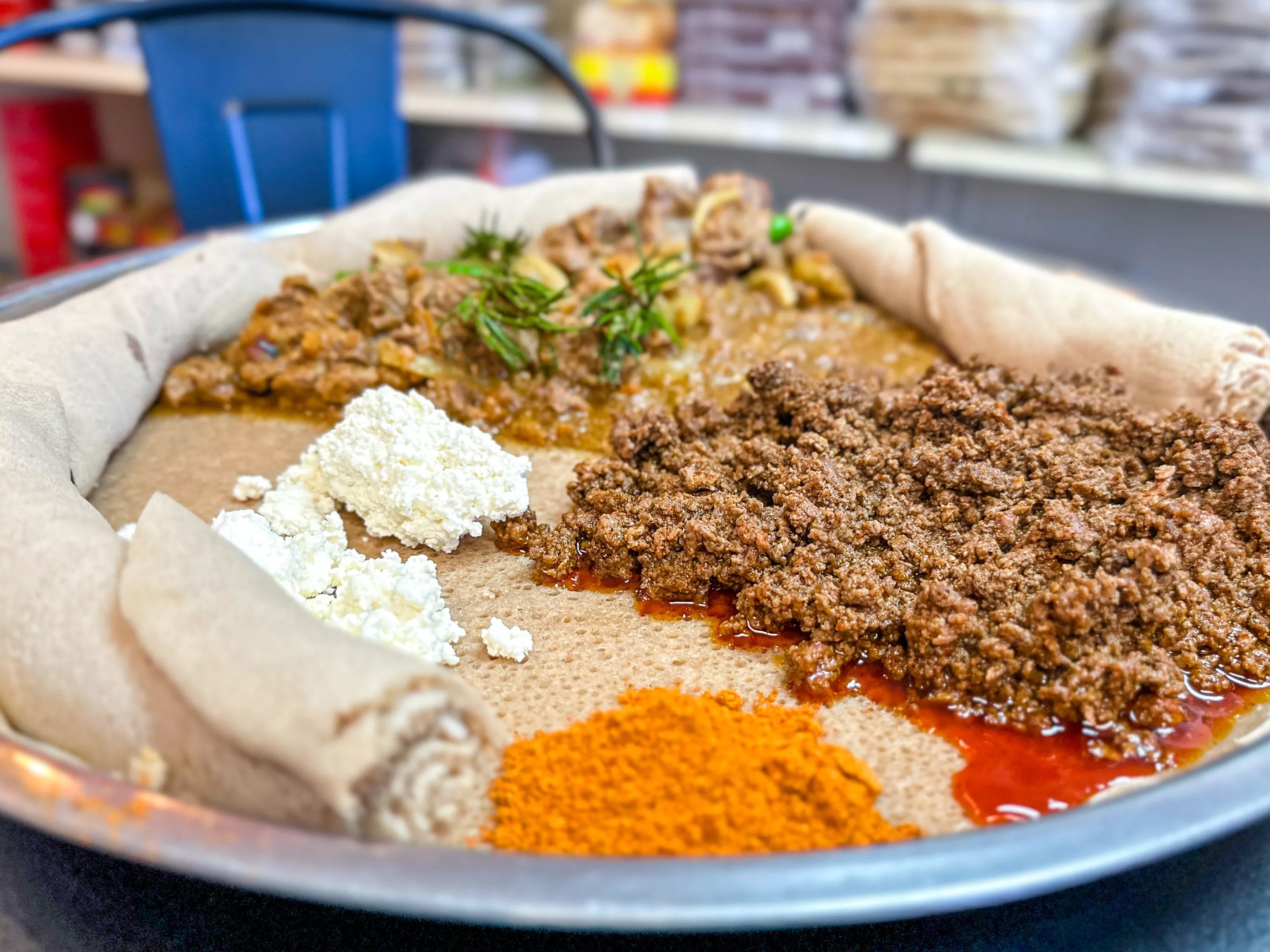 Lamb tibse (top left) and beef kitfo (bottom right) with house-made cheese and a lot of injera used in lieu of traditional cutlery.