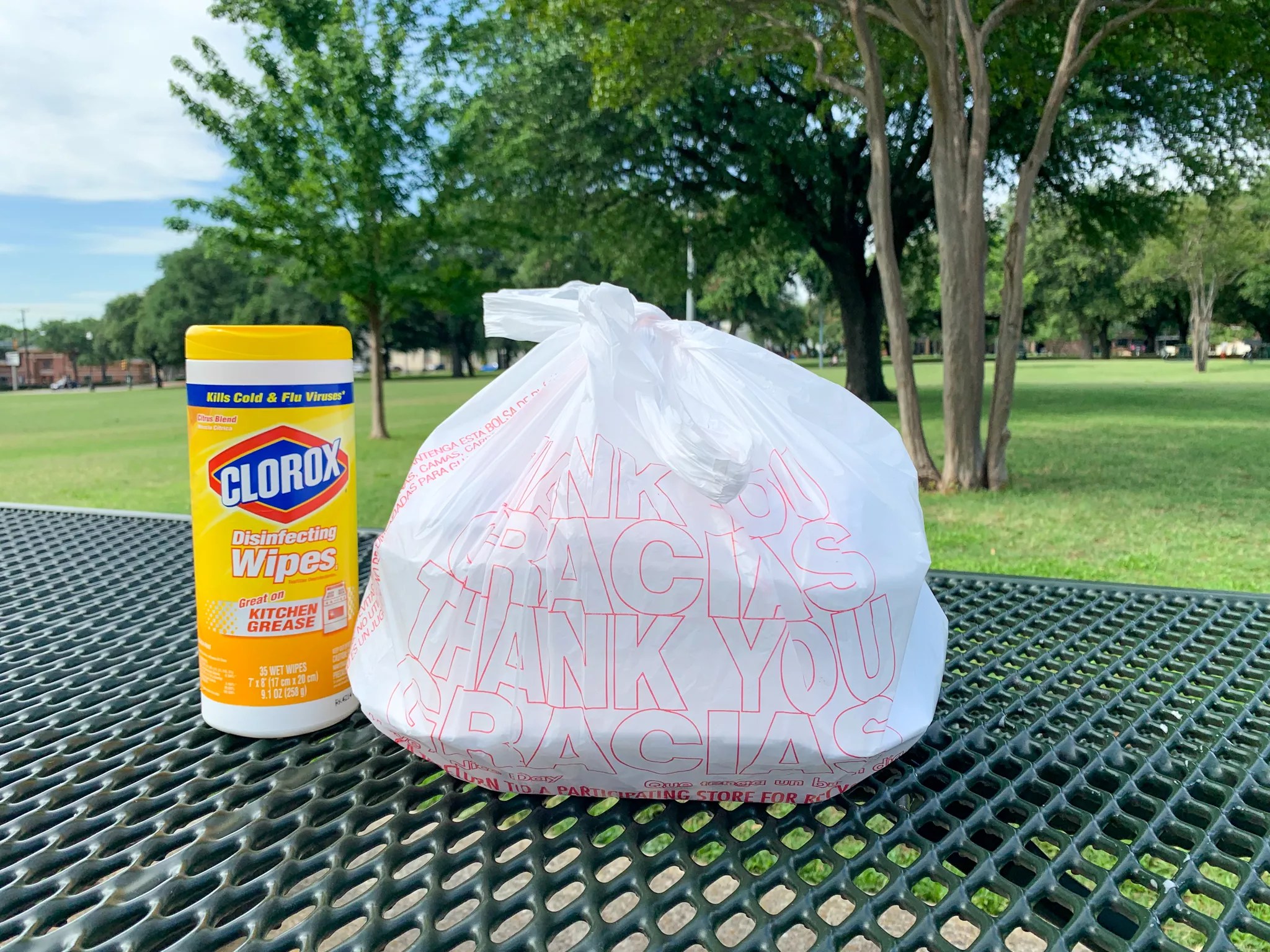 Use the sanitizing wipes you keep in your car to clean the table top – the city of Dallas isn’t sanitizing, which is fair since it has plenty to do and it just furloughed a bunch of people, and 235 employees out of the total 472 were from its Park and Recreation Department.