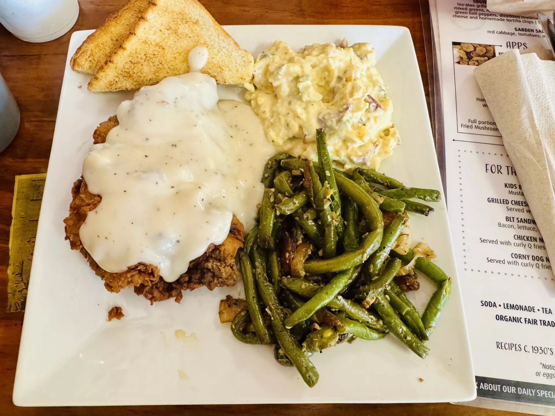 All burgers are cooked to order, and it’s worth noting that the menu says all patties are cooked well done. But in our experience, it was closer to medium (or maybe medium-well). I usually prefer medium-rare to medium, but these burgers are still perfectly juicy. They’ve been grilling burgers here longer than we’ve been alive; they obviously know what they’re doing. We went with the “Old Fashioned Burger” basket ($9), which is a half-pound patty with mustard, lettuce, tomato, onion and pickles. For a side, you’ll choose from hand-cut fries, handmade potato chips, sweet potato fries, waffle fries or curly fries. Chicken-fried steak, “loaded” potato salad, green beans and toast. Nick Reynolds