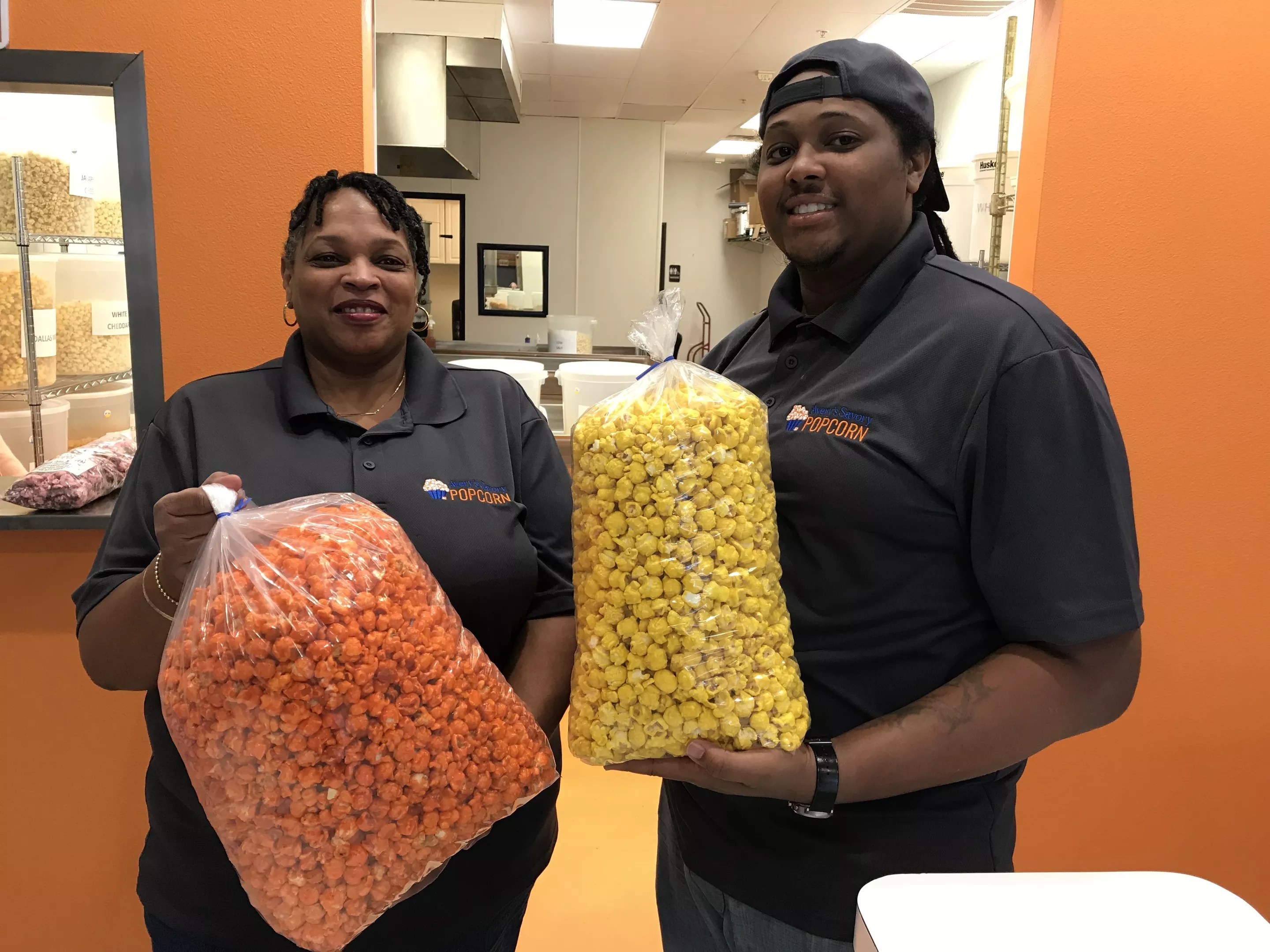 Sherry Avery (left) and her son, Steffon Avery, show off bags of goodies at their new popcorn shop, Avery's Savory Popcorn.