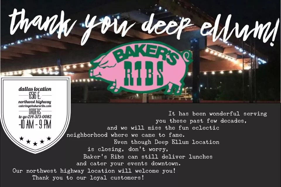 Neighborhoods change – especially popular ones. There’s no denying it, and fighting it likely won’t get you very far. This weekend, Deep Ellum will lose another of the businesses that made it what it was. Baker’s Ribs announced yesterday on Facebook that, as of Sunday, they’re shuttering the Deep Ellum location and moving the operation to their Northwest Highway location.