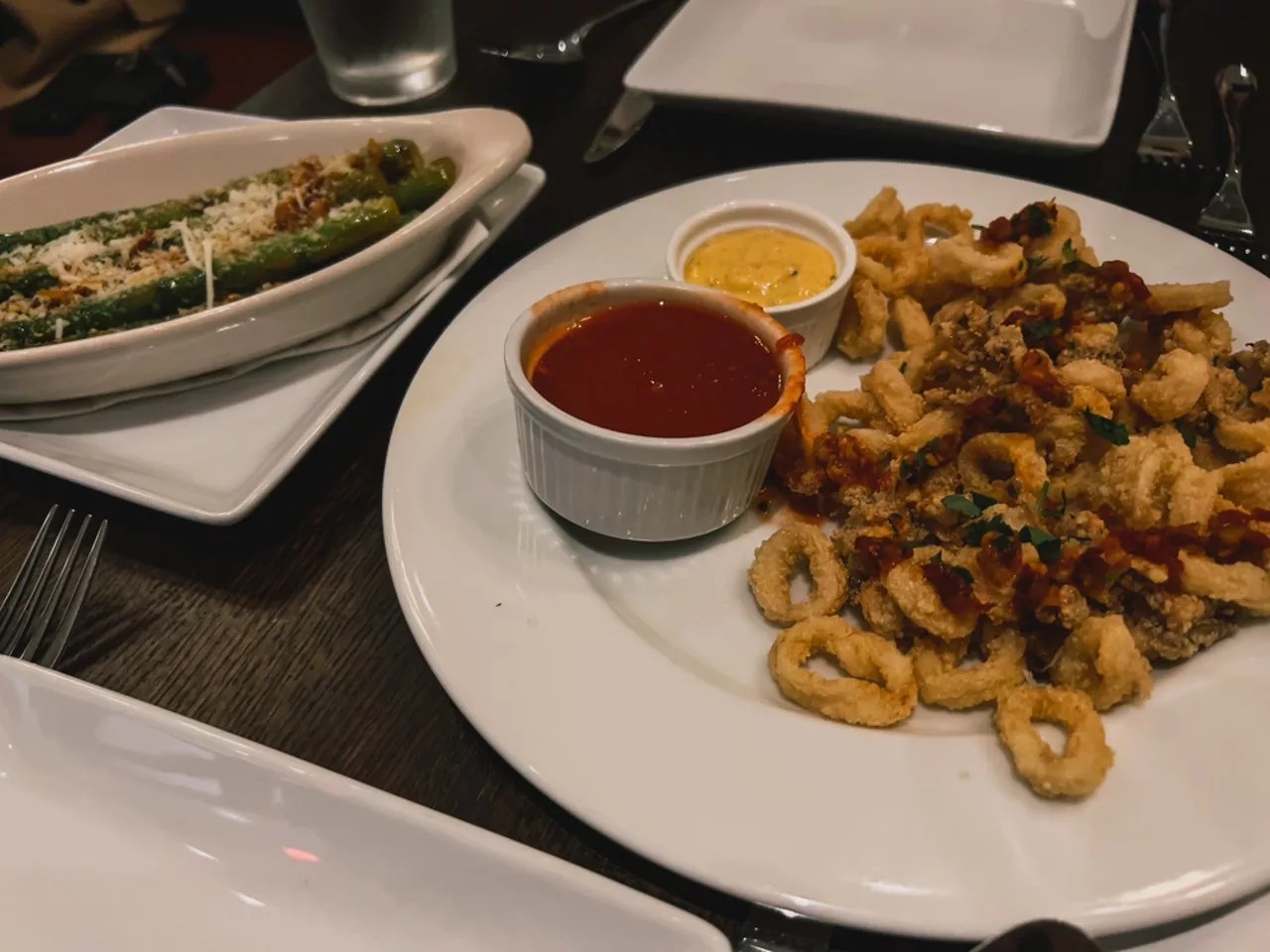 Asparagus Calabrese and fried calamari.