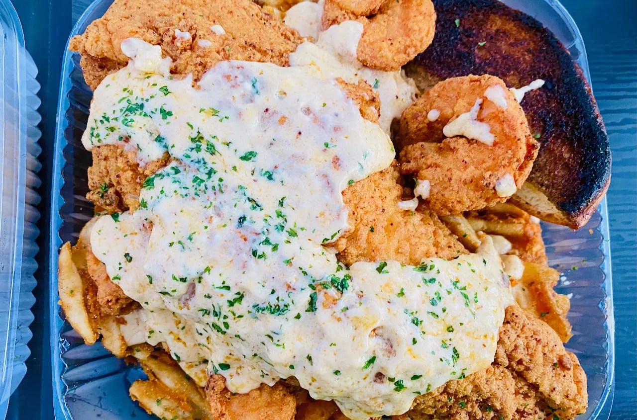The Bells Bayou Box is a deep-fried paradise with a generous portion of waffle fries, fried fish, fried shrimp all covered in a creamy seafood sauce (photo at top).