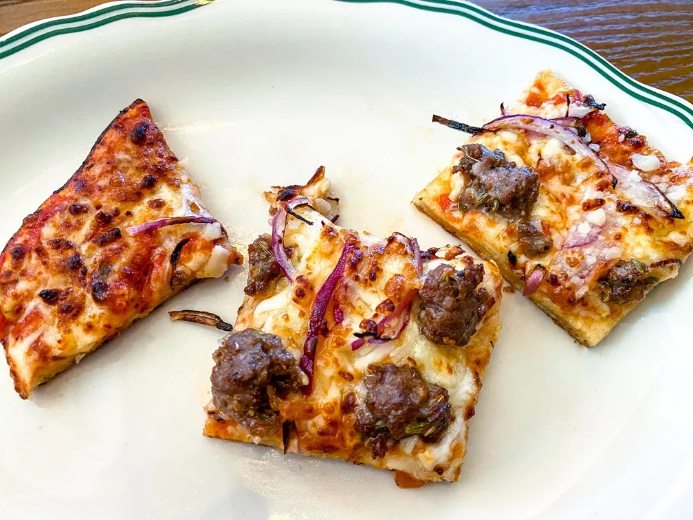 Louie’s sausage and onion tavern-style thin crust pizza.
