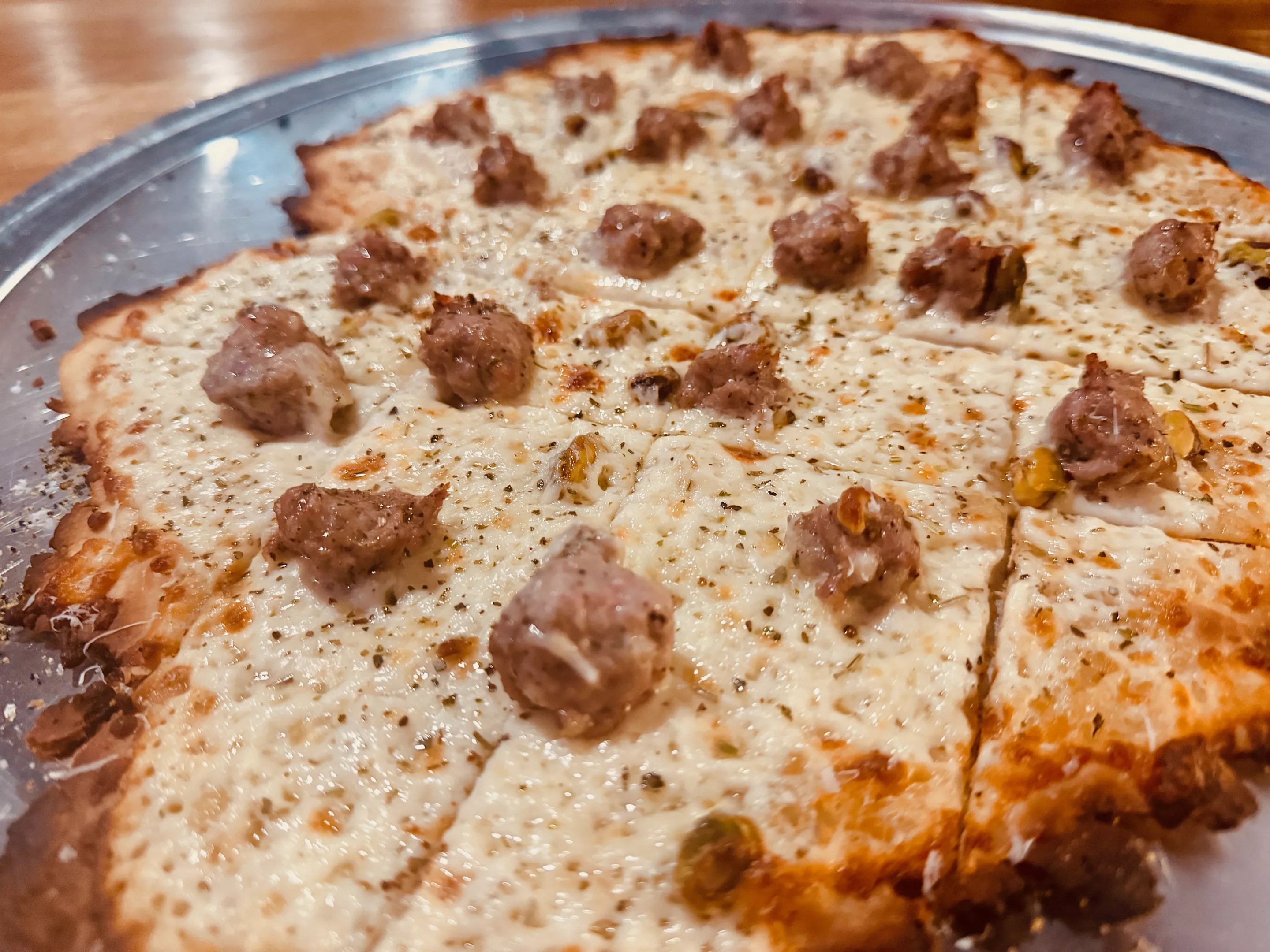 Thin crust tavern-style Italian sausage and onions on Rosati’s version of Chicago tavern-style thin crust pizza.