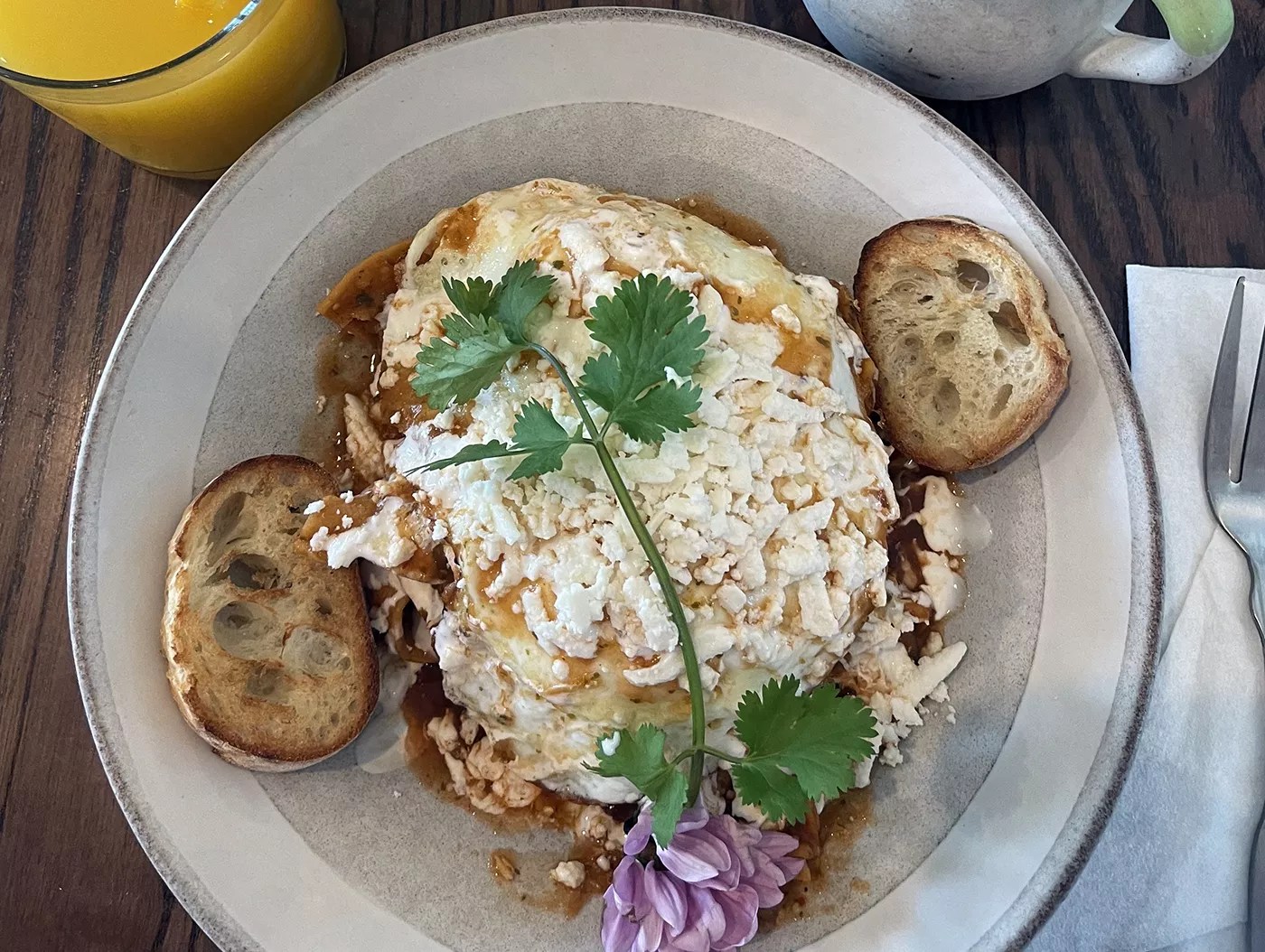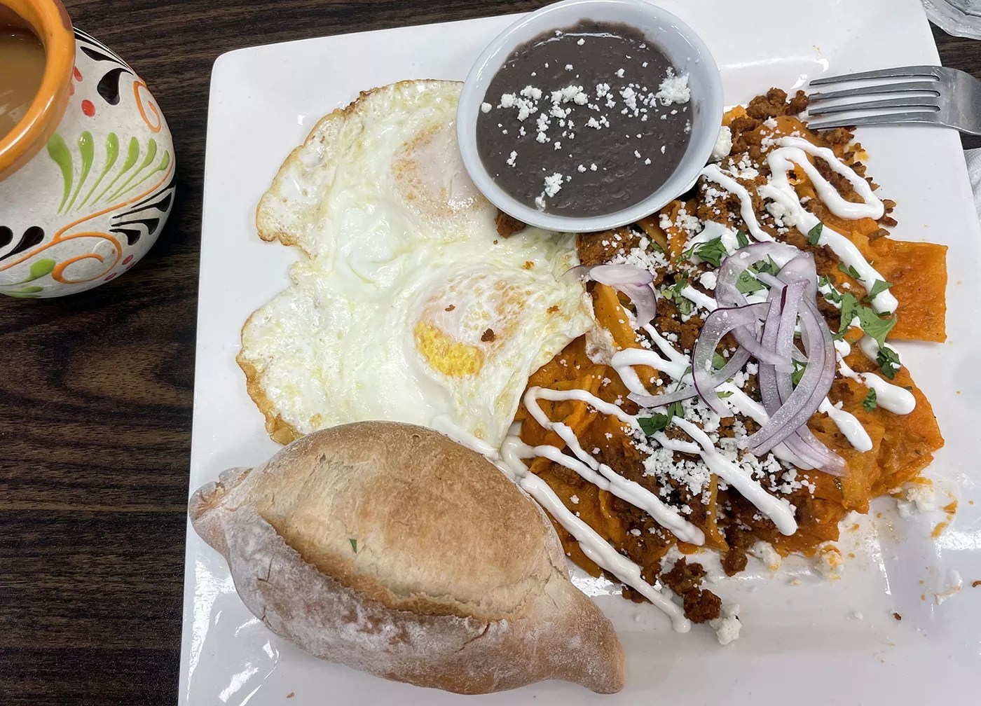At Como en Casa, the chilaquiles are served with a bolilo roll. Carbs never felt so good.
