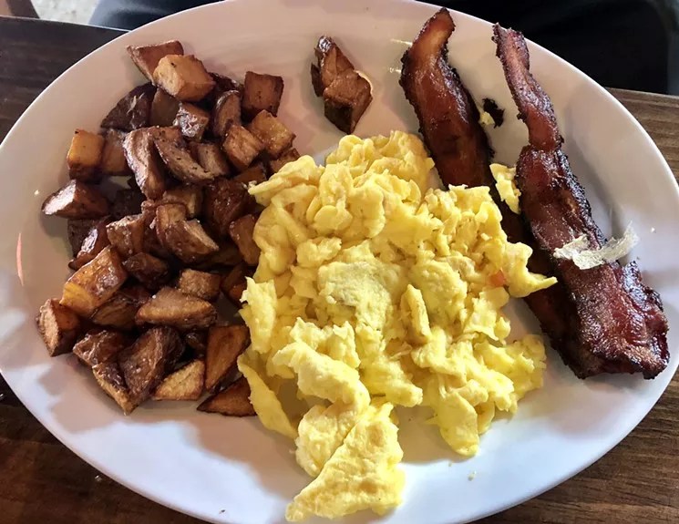 You know when you go someplace to eat with a group of people, and everyone at the table actually likes what they order? That can happen at LUCK, which is why it’s one of our favorites. The German bierocks ($10) are meat- and cheese-filled pocket pastries served with beer cheese fondue and au jus – they’re allegedly for sharing, but you could make a meal to yourself out of these savory bites. LUCK also has a pretty excellent pastrami, which they generously use in a Benedict ($14) with Texas toast, two poached eggs and hollandaise. And while a year of brunches can have you sick and tired of shrimp and grits, it’s actually worth ordering here ($18) with cheese grits, a creole sauce, shrimp, green onions and an egg – they know what they’re doing at LUCK.