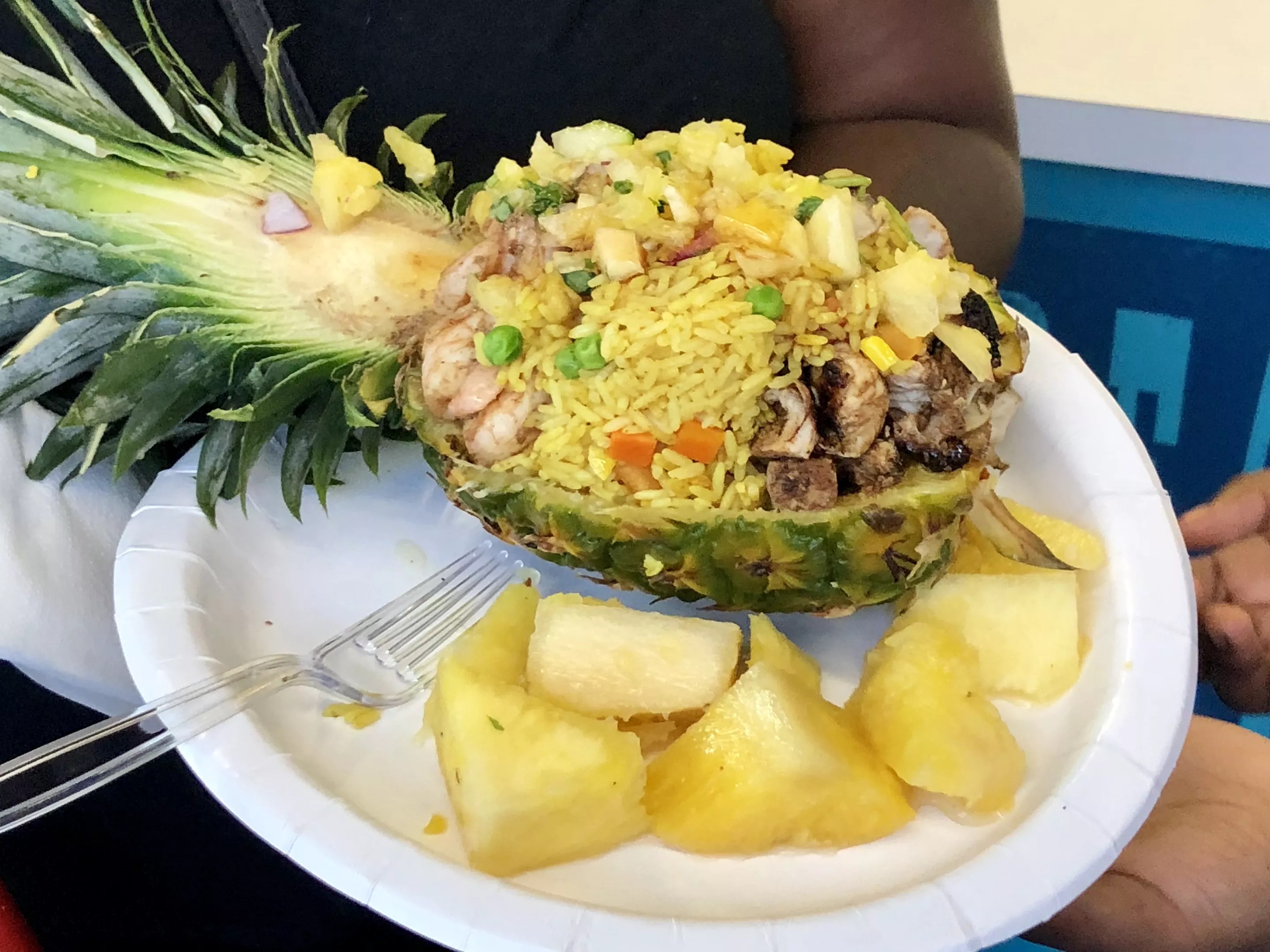 Caribbean Pineapple Korn-a-Copia (30 coupons) is marinated grilled chicken and shrimp served over Caribbean rice.