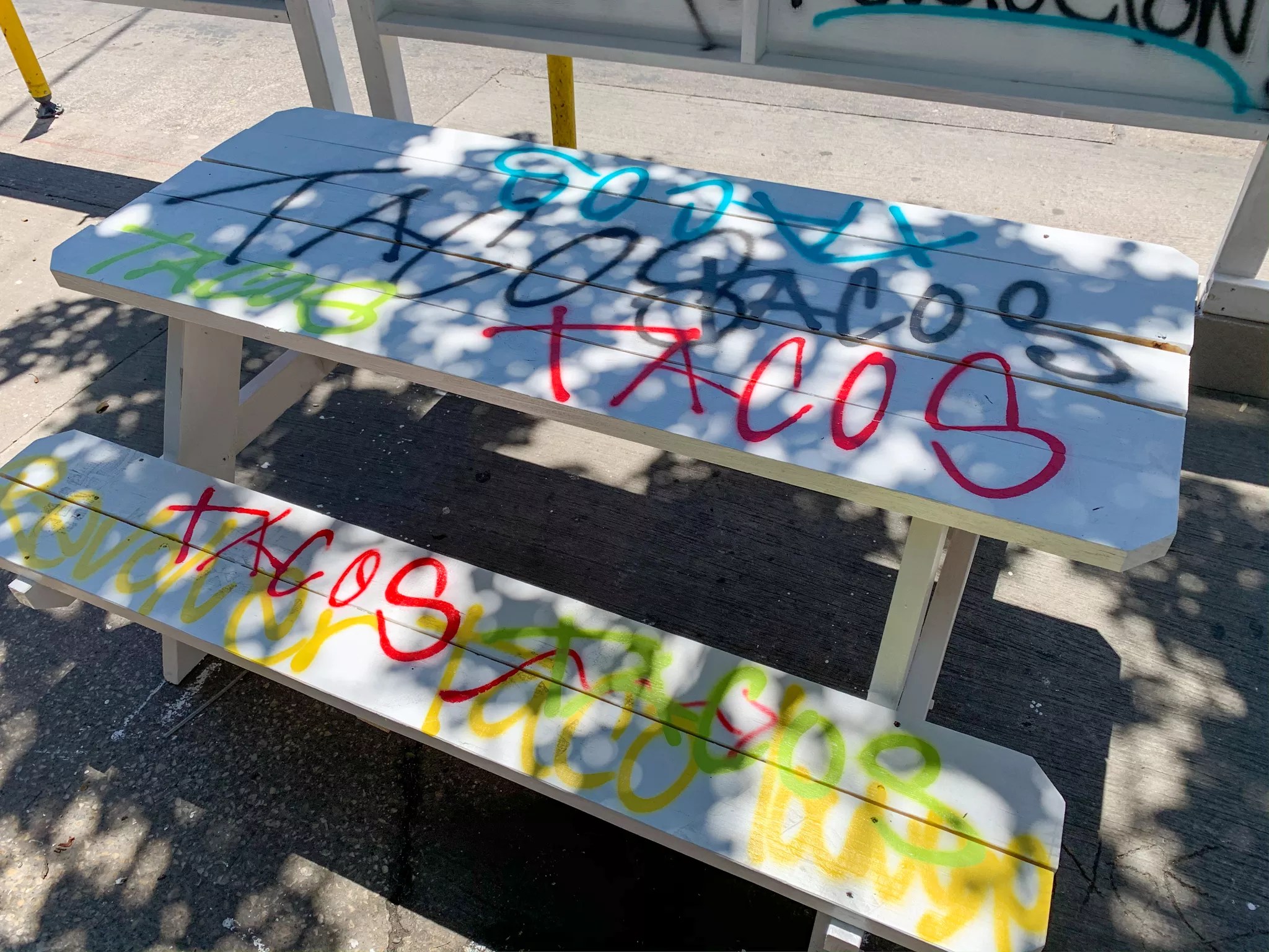 It’s a simple setup with white-painted wood making a partial perimeter with spray-painted words all over it and the two picnic tables. One table sits in the basking sun, the other one, worthy of coveting, is placed perfectly under a nearby tree.