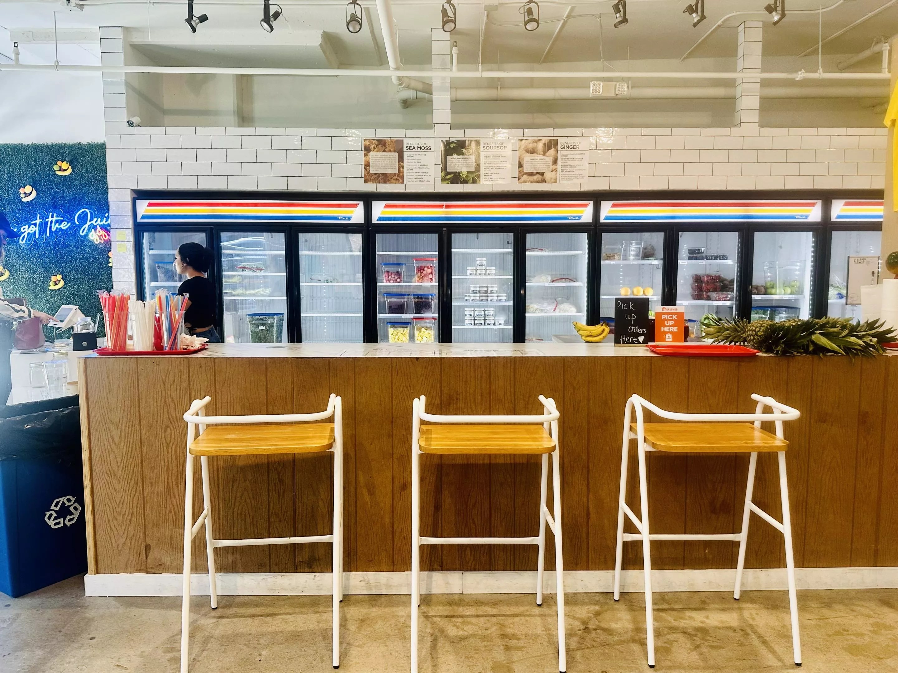 Squeezers is decorated with paintings throughout (the largest being our friend “Valley Girl”) as well as two grass walls, a classic backdrop for Instagram stories. One has a neon sign that reads “You got the juice” in blue cursive. It’s an irresistible photo op for someone who ordered the juice.