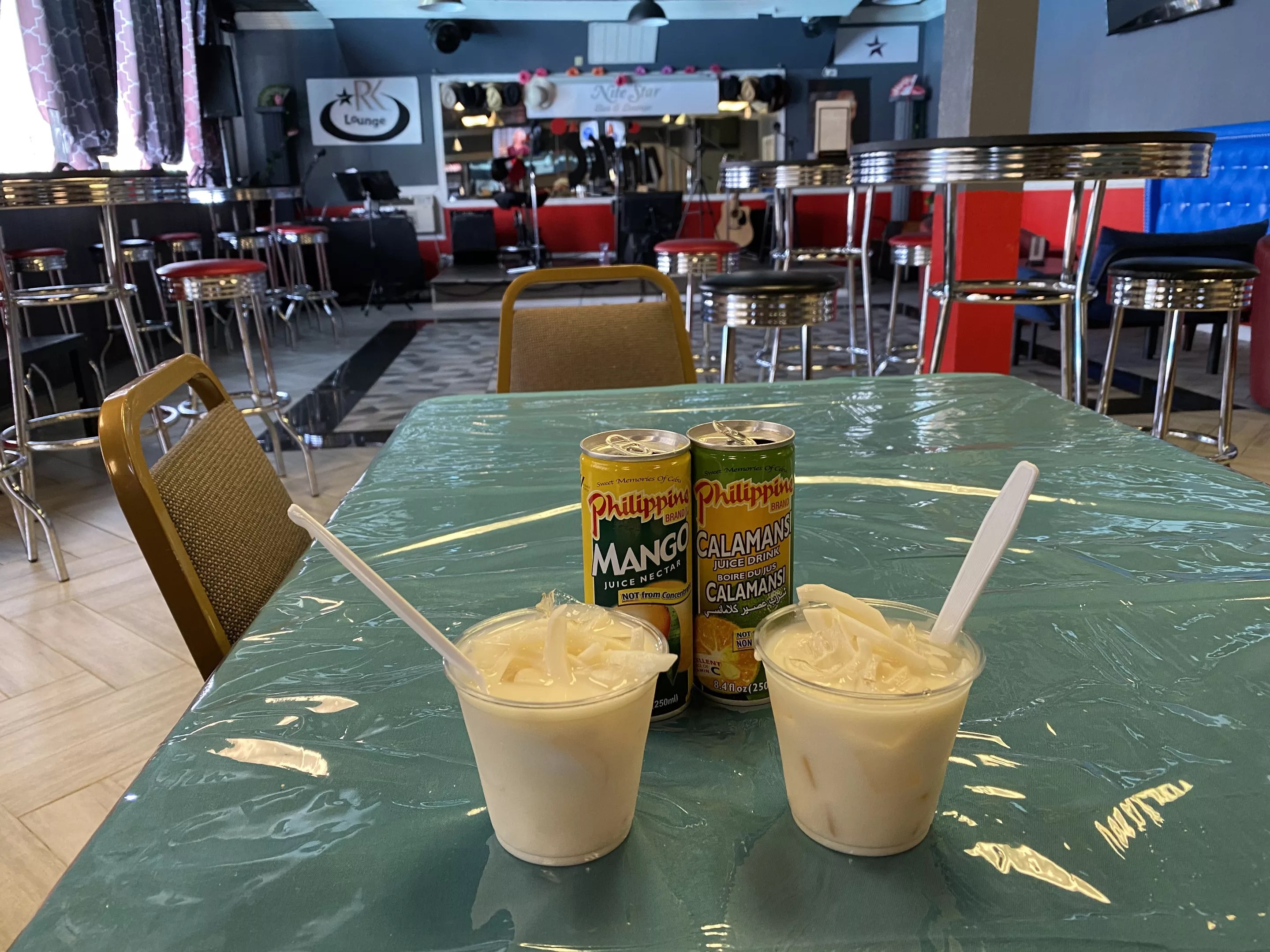 While you search for the restaurant Kanin, it may come as some surprise when your navigation app leads you to the R Nite Star Inn and Suites. Once inside you’ll find yourself in the lobby where a sign leads you to the back. A few steps down the short ramp opens up to a large space with a bar to the left, a stage to the far right and a few tables and a dance floor in between. The motel swimming pool serves as a backdrop and a nonstop medley of Sade songs sets the mood. It’s all a bit peculiar but adds to the curiosity and the allure of the experience. Dining room, dance floor and karaoke stage complete with proper Filipino refreshments mango juice, calamansi juice and buko milk drink Felicia Lopez