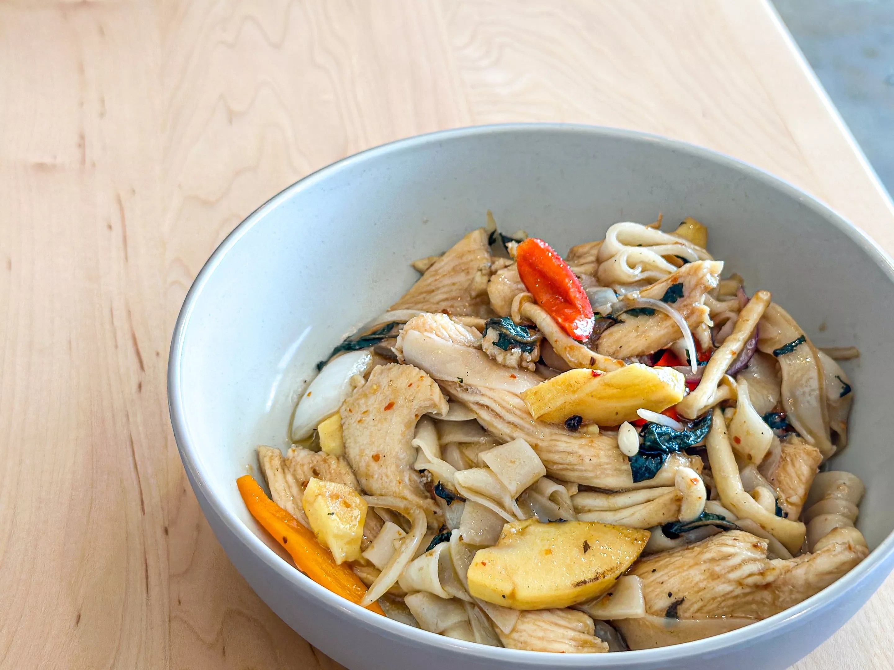 Pad kee maow followed: You can choose the protein (we went with chicken) as well as the spice level (we opted for medium). A decent portion, noodles cooked correctly and a pleasant variety of vegetables, such as bright red bell peppers, bamboo shoot chunks, and enoki mushrooms, rounded out this dish.