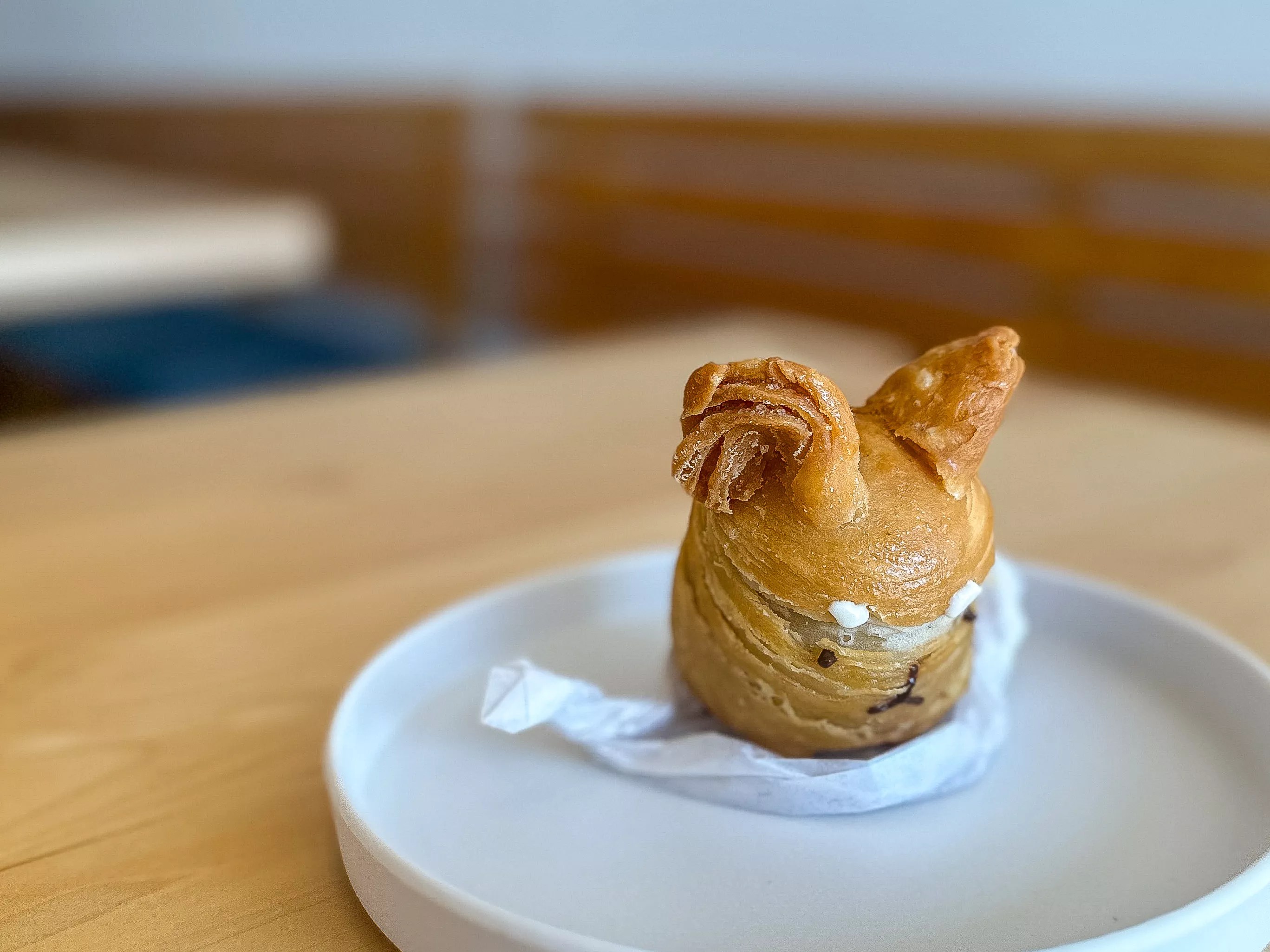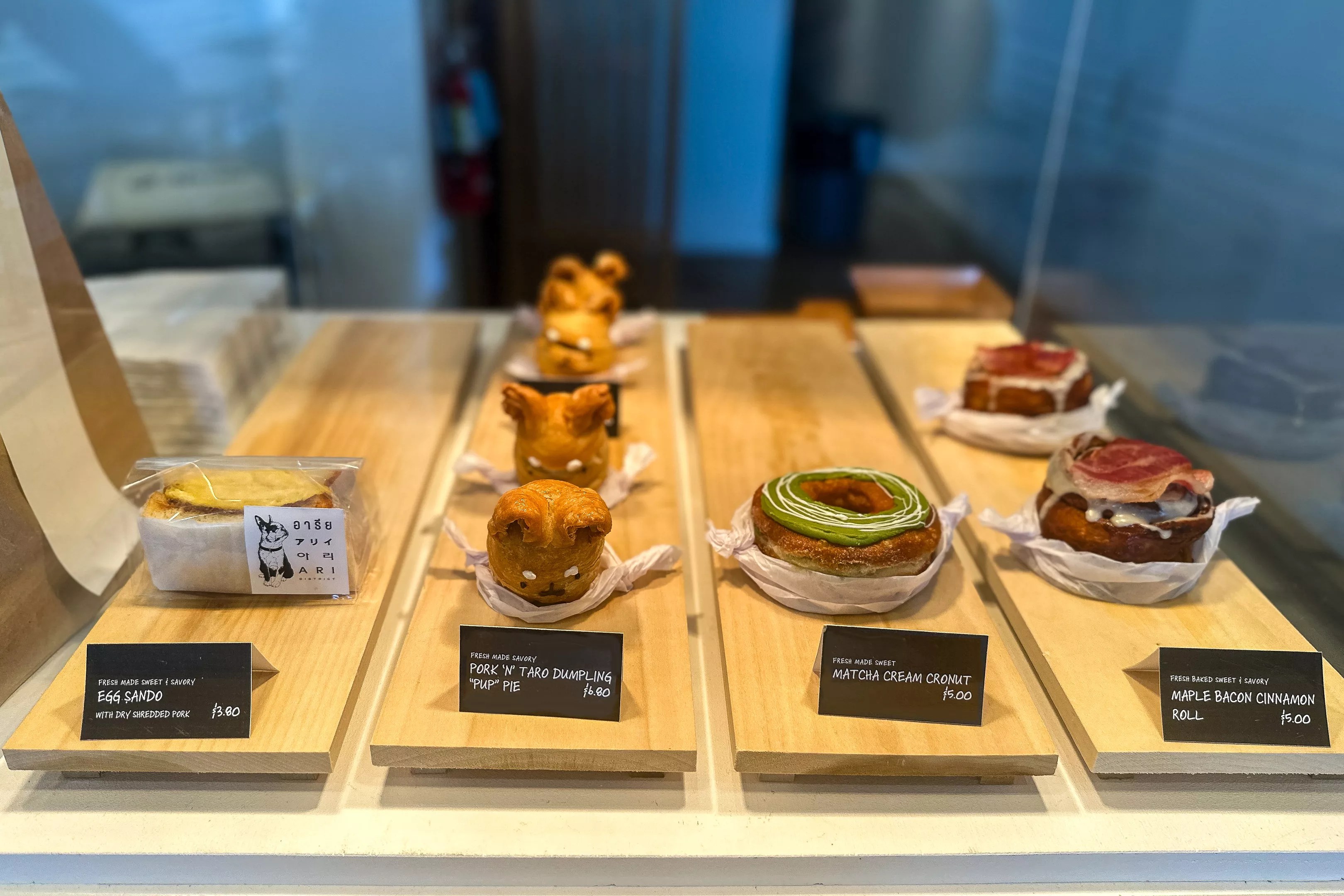 The counter displays the sweet and savory pastries, which can change daily. Selections may include spinach rolls, cookie butter cinnamon rolls, matcha cream cronuts and maple bacon cinnamon rolls, to name just a few. Perhaps the signature pastry is the “pup” pie stuffed with pork and taro or curry, which often sell out before closing. (In fact, we had to make two trips so we could try one.)