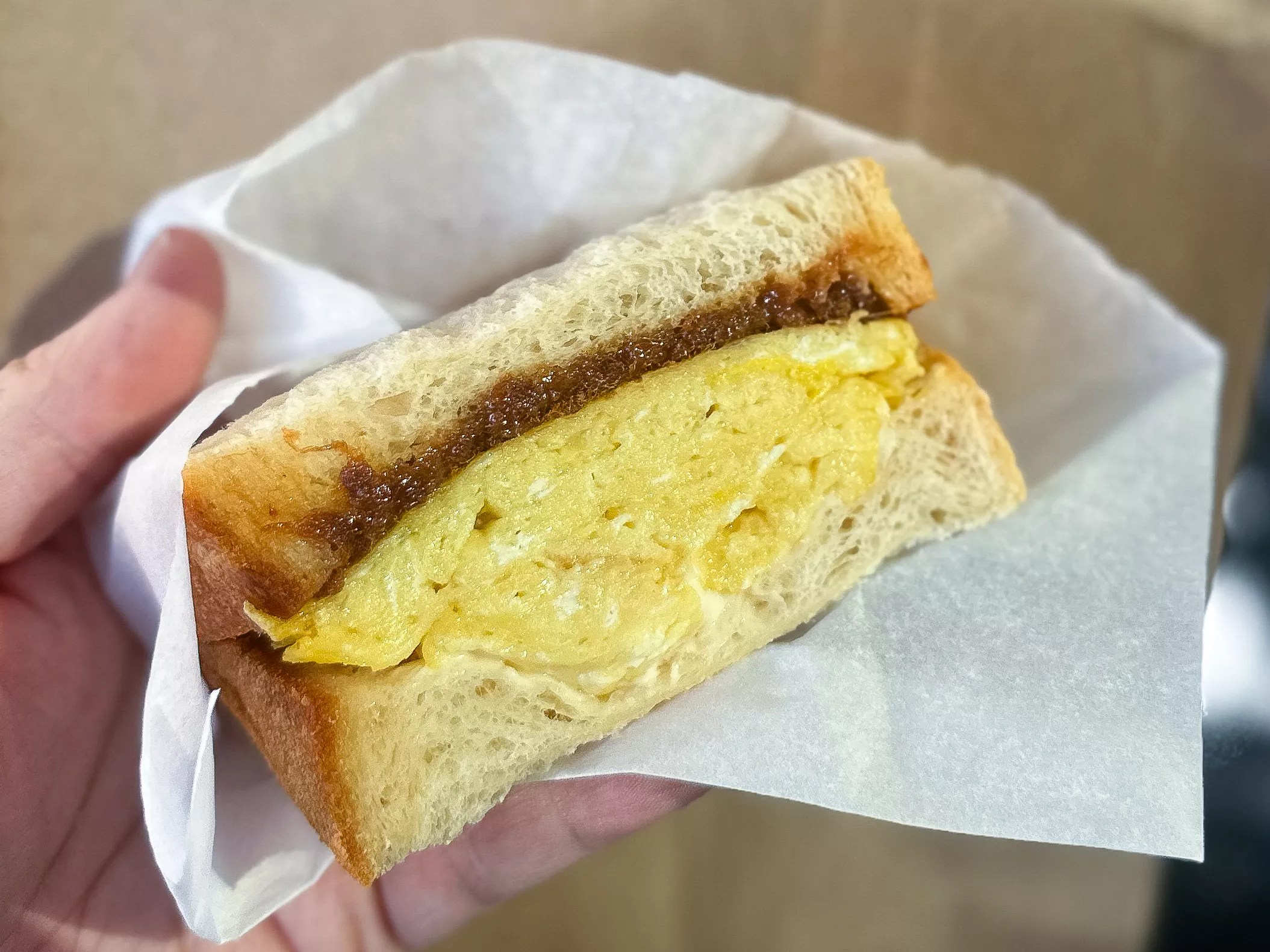 Next up, an egg sando, a sandwich of white bread filled with scrambled egg and dry shredded pork. It’s just the right size to eat on the go and priced right at under $4. The slightly sweet shredded pork worked wonderfully with the cooked-just-right egg.