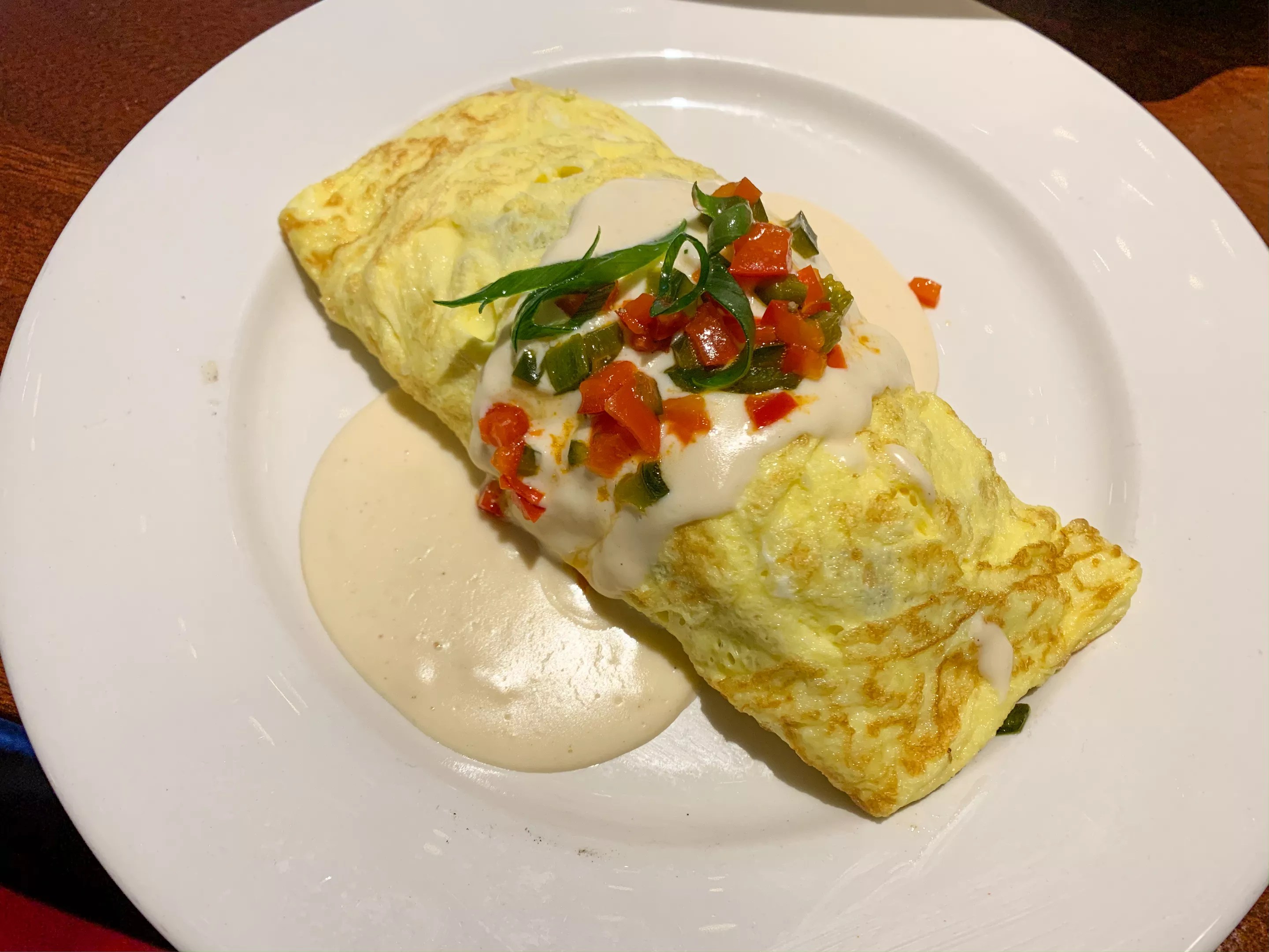 The presentation lacks excitement, enough to where once you take a bite, you’re surprised to find meat properly seasoned among peppers and plenty of Swiss cheese. The bechamel is full of flavor with plenty of garlic and not too much flour – the latter of which frequently gives us flavorless sauce. The chopped meat could be more tender. Sure, we’ll accept such texture when slathered with cheese in a Philly cheesesteak, but sitting at home in a thin omelet, a gentler chew would be more appropriate.