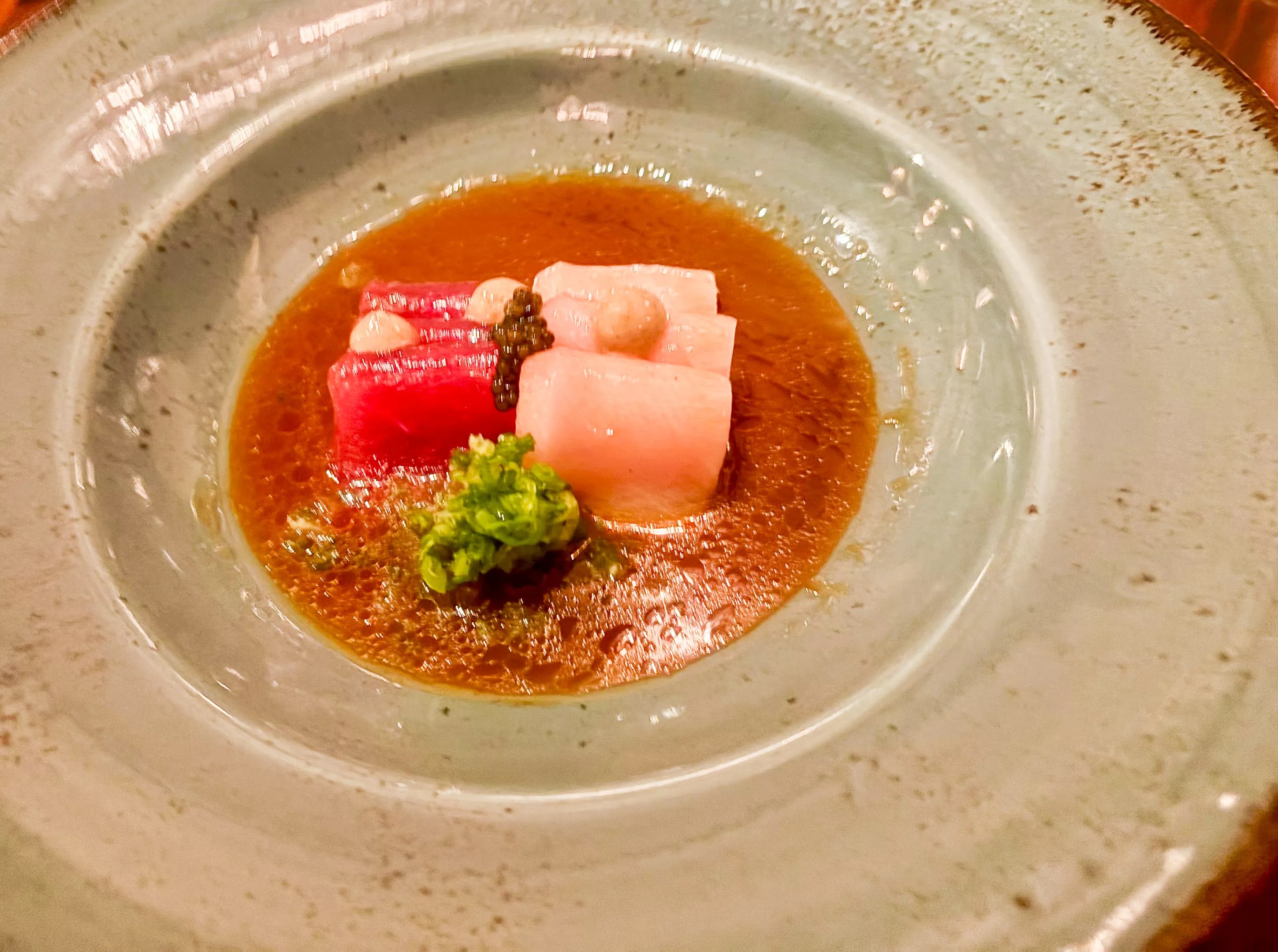 We started with the Truffle Sashimi ($25), which comes with three pieces each of tuna and hamachi in a puddle of spicy chili ponzu topped with a bit of caviar and a “Black Truffle Purée” per the menu, a mixture of truffles, olive oil and salt. The earthy richness of truffle puree blends well with the delicate umami of fresh fish, punctuated by the vibrant notes of spicy chili ponzu. Another good choice was the hamachi crudo seasoned with a nice matcha salt.