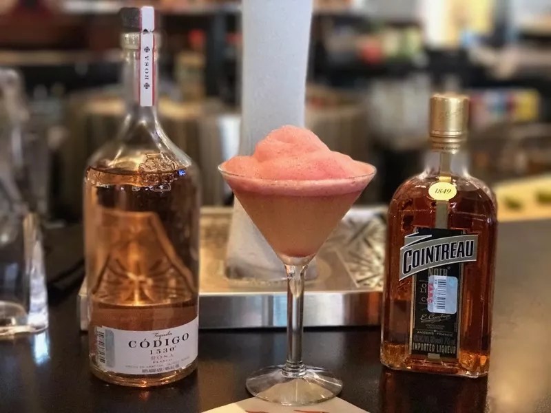 (Código 1530 Blanco Rose Tequila, Cointreau Noir, lemon and lime juice, smoked vanilla agave, hibiscus air)