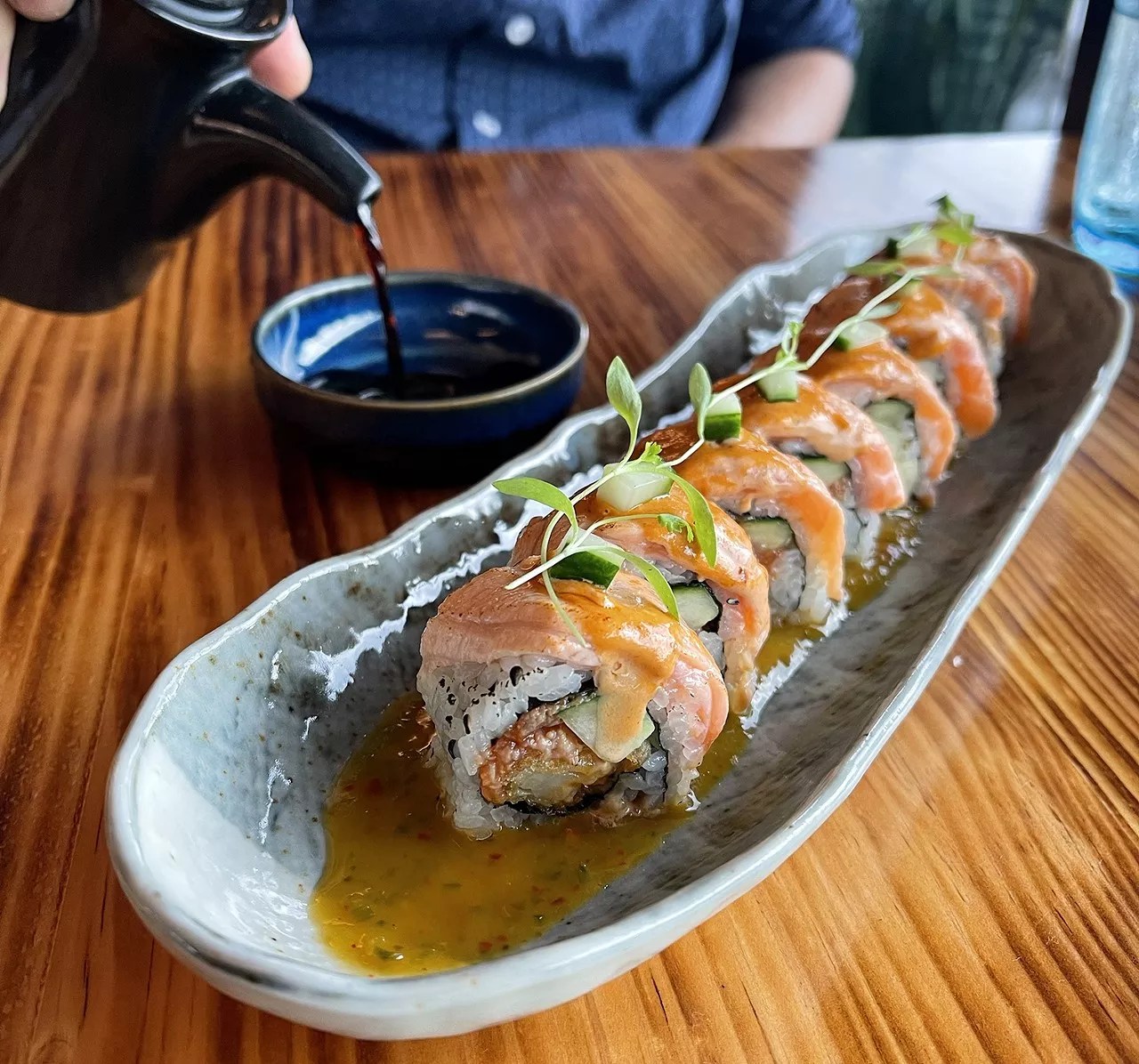 To top off the meal, we chose the restaurant’s most popular sushi roll, The Perfect Storm. The $24 roll includes sushi staples shrimp tempura, spicy tuna and cucumber. Atop the roll is a lightly seared salmon belly aburi with a drizzle of chipotle aioli. The roll sits over a light mango salsa. Skip the soy sauce here, as it overpowers the roll’s more delicate flavors.