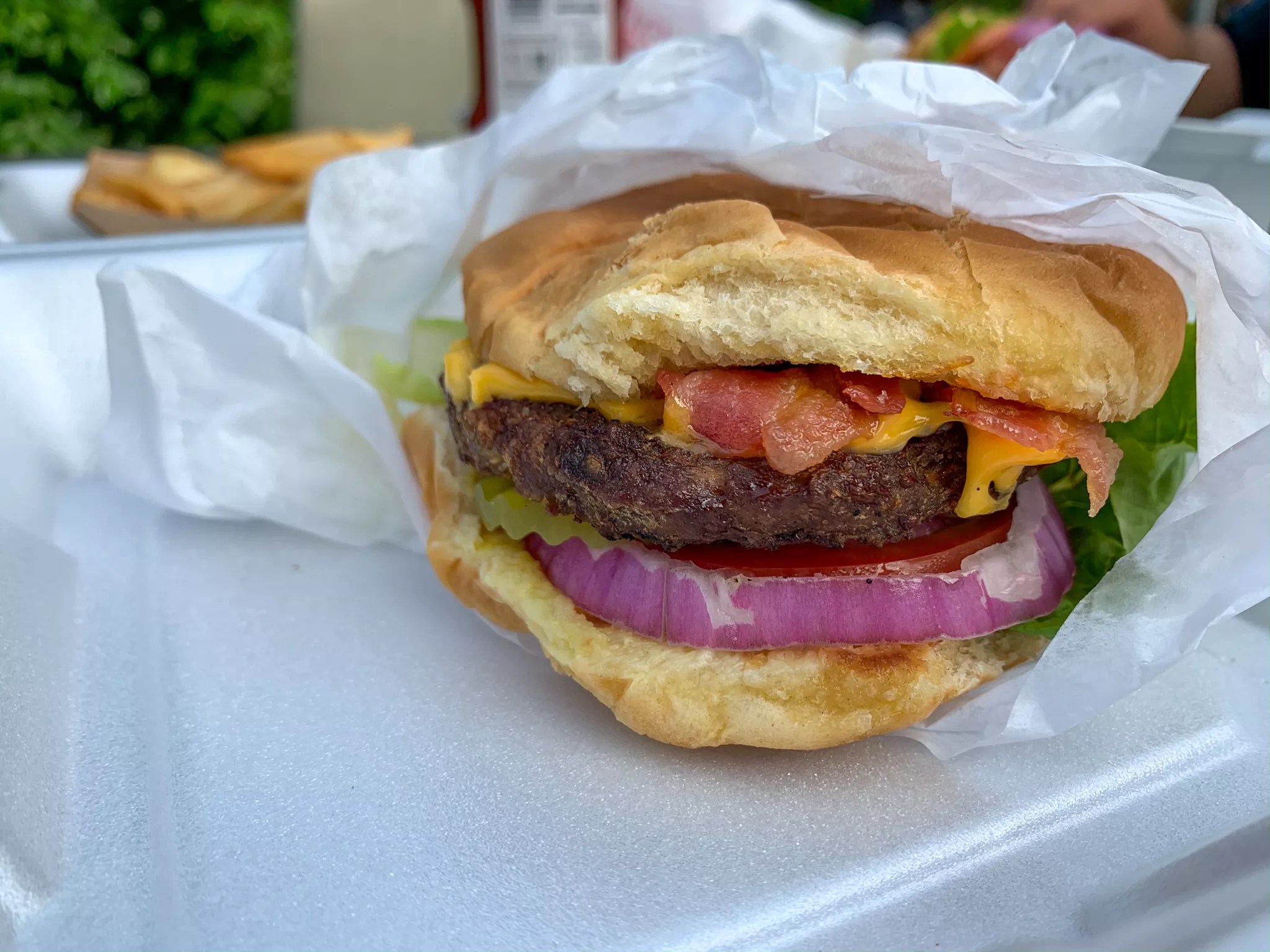 The American cheese melts perfectly, accomplishing its job here alongside a couple of crisp but otherwise unremarkable slices of bacon. The tomato, lettuce and onion are fresh enough, all in a bun that seems to squish and stays squished when it’s picked up.
