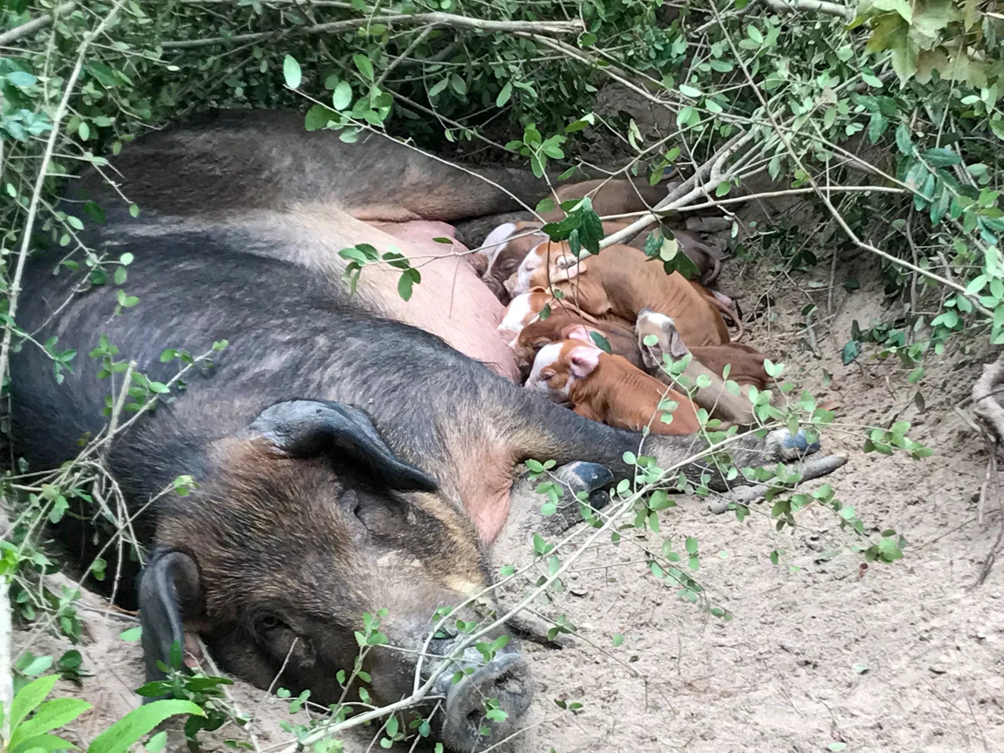 A mother pig feeds her babies at Chubby Dog.