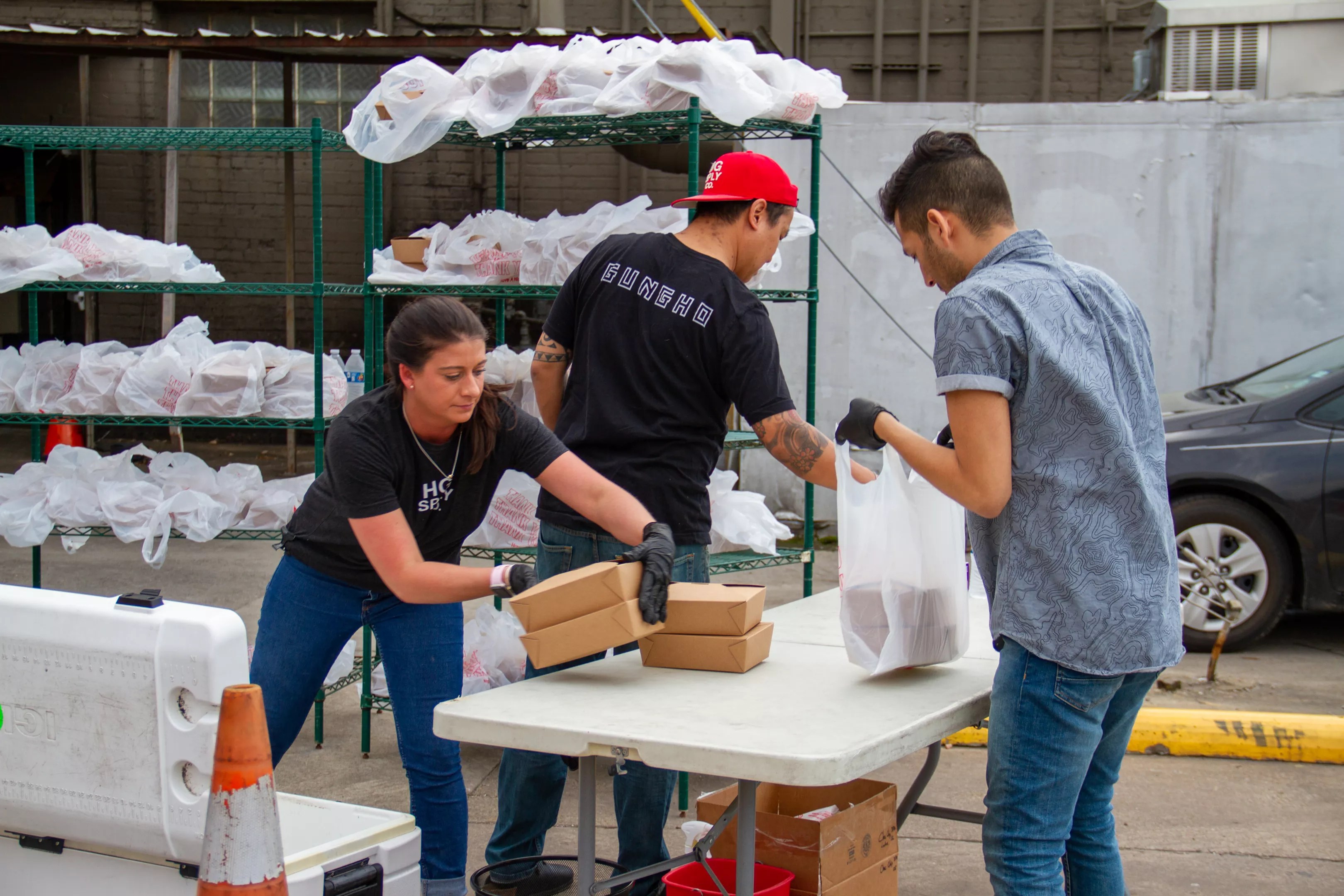 A volunteer hands over free, hot meals. Heard That Foundation partnered with 8020 Concepts to lend support to hospitality industry professionals who lost their jobs from the impact of COVID-19.