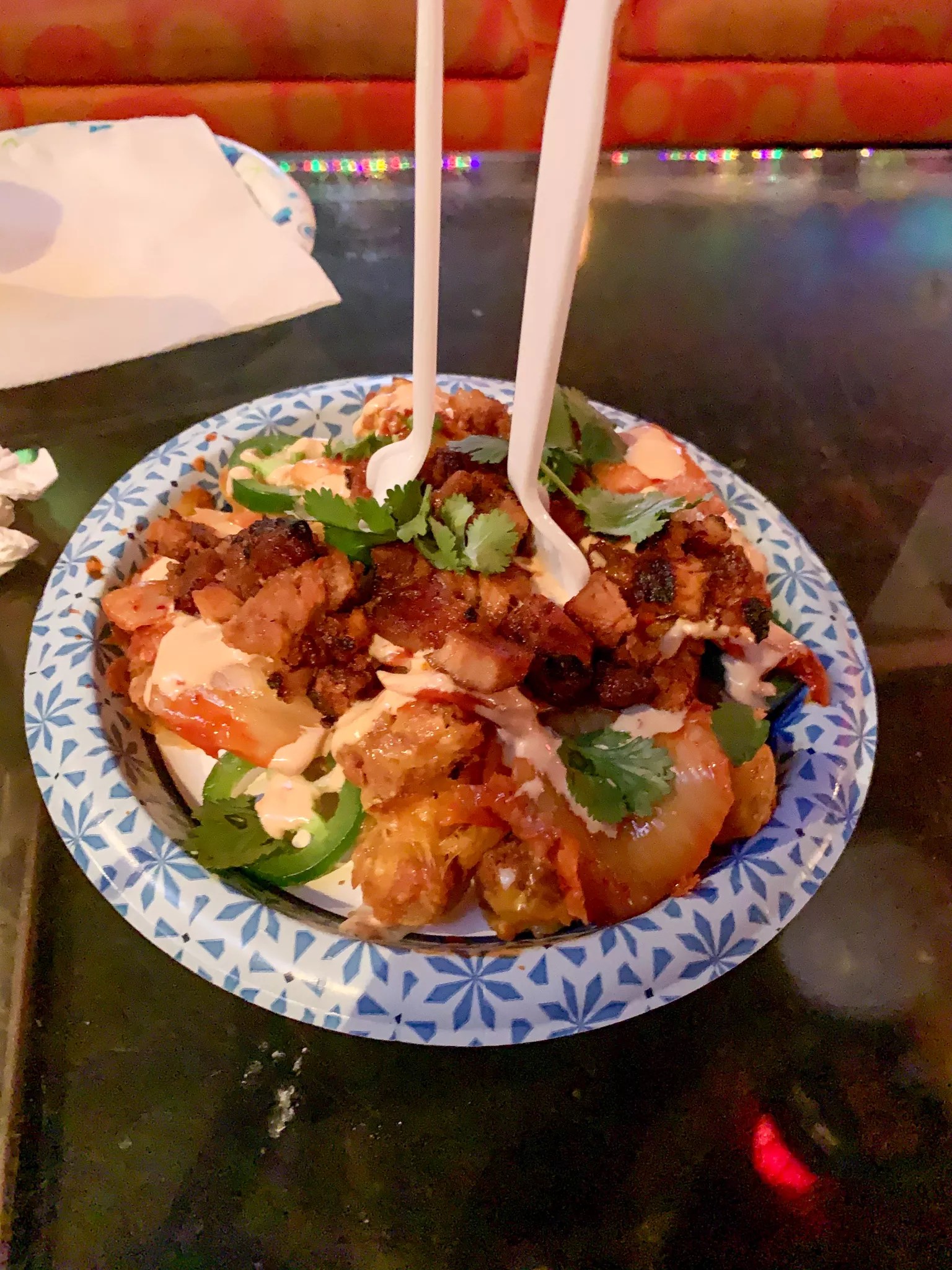 Another thing about eating alone: Not having to share the kimchi tots (topped with pork belly here)