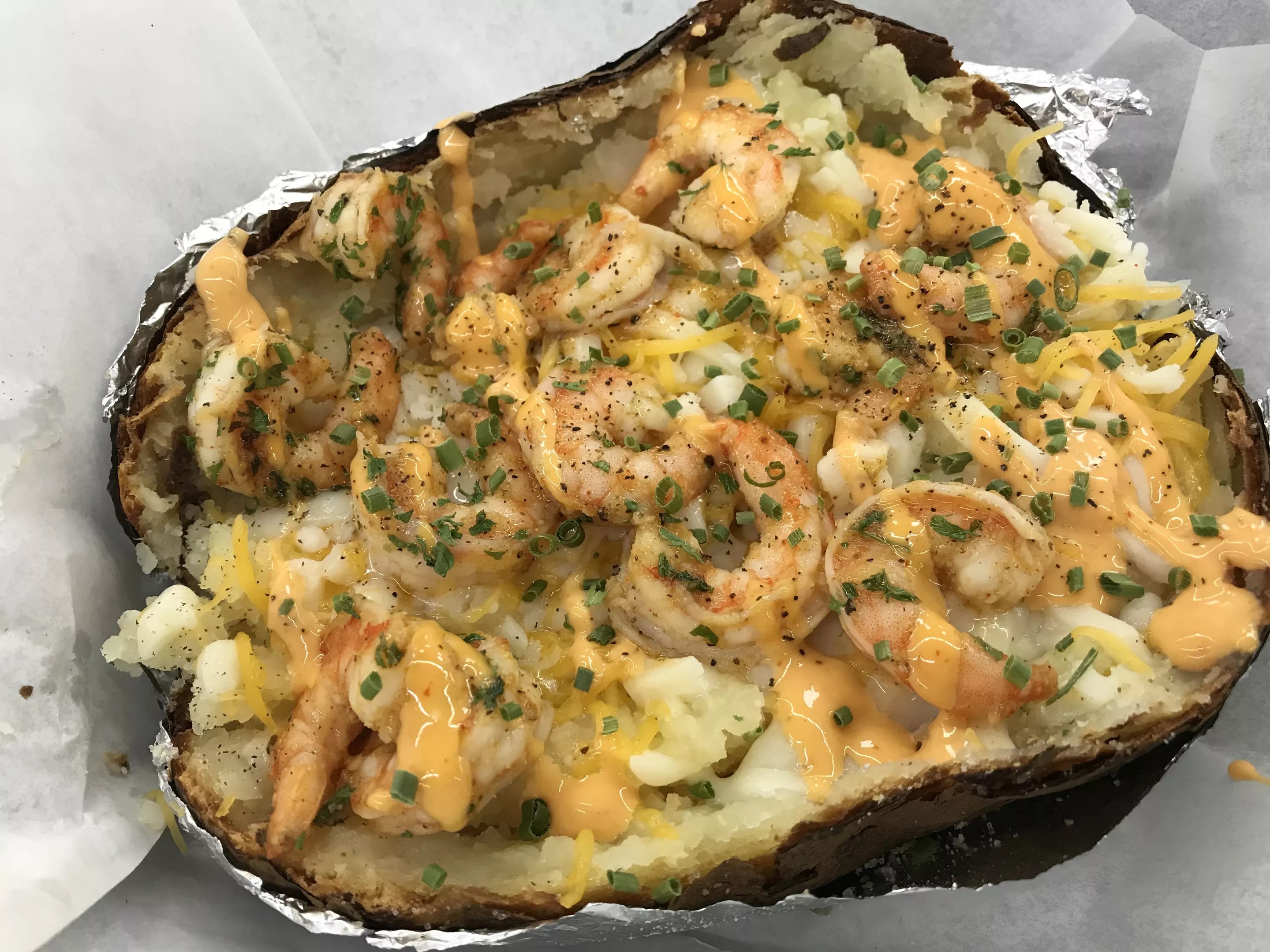 First choose four meats from a list of chicken, shrimp, turkey, chopped ham, chopped steak or ground beef. Then load it with cheese, sour cream or ranch, bacon bits, chives, onions, peppers and the Crazii Sauce, a creamy Sriracha mix. Sounds and looks like a lot, but the ingredients and seasonings work together beautifully.