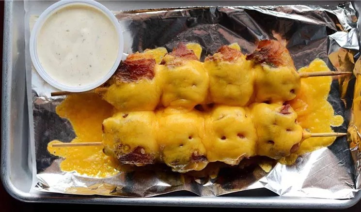 Each tot is cared for – this isn’t a scatter of loose cheese or bad bar nachos. A jalapeño sliver sits against the tot before it’s wrapped in smoked bacon around the potato, preserving it in pork like you’re taking it on the Oregon Trail. The tots are skewered, eight to an order, cheddar rained and melted over everything. Dunk and swipe in ranch to go full-tilt Dallas comfort food.