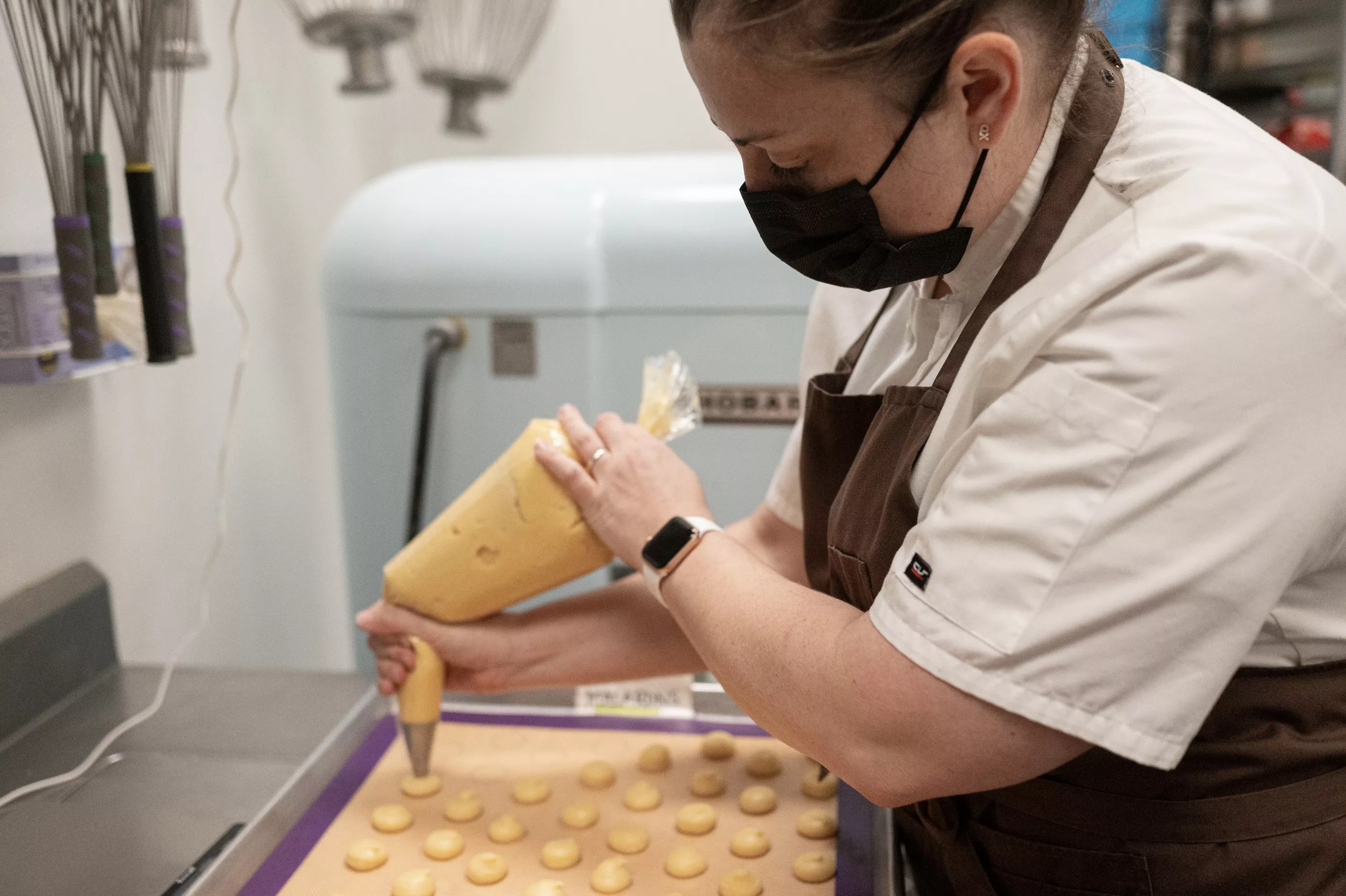 On a Wednesday afternoon with Valentine’s Day approaching, Meyer was searching her kitchen for round plastic trays to hold stacks of bright macaroons, which are usually big sellers in mid-February. She has a stack of cellophane lids, but no trays.