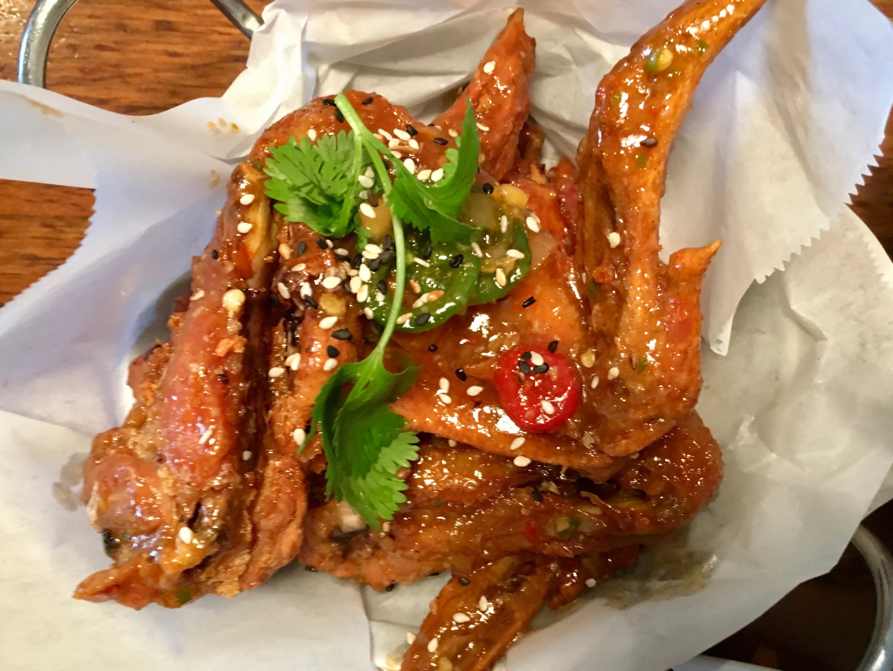 So, in one of the most football-crazed cities in the world, no one should be surprised that there are dozens of ways to eat lightning-hot chicken wings. There are the right-as-rain Sysco wings in the cherry baskets, doused in chemical hot sauce and butter, fried, served with heart-stopping blue cheese sauce. Then there are careful, Thai-inspired options, glazed in garlic sauce. Some arrive in parchment, elevated with herbs. Some will hit your lips like napalm – meant to wound your insides with capsaicin extract.