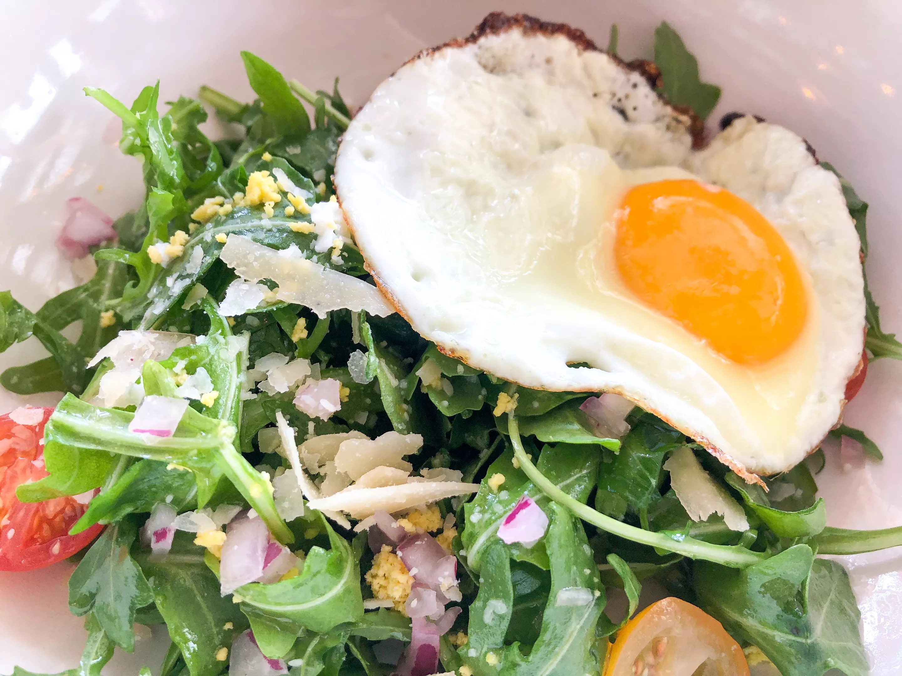 Arugula and egg salad: arugula, avocado, red onion, roasted beet, Parmesan, tomato, radish, sunny-side-up egg and lemon vinaigrette (half portion is pictured)